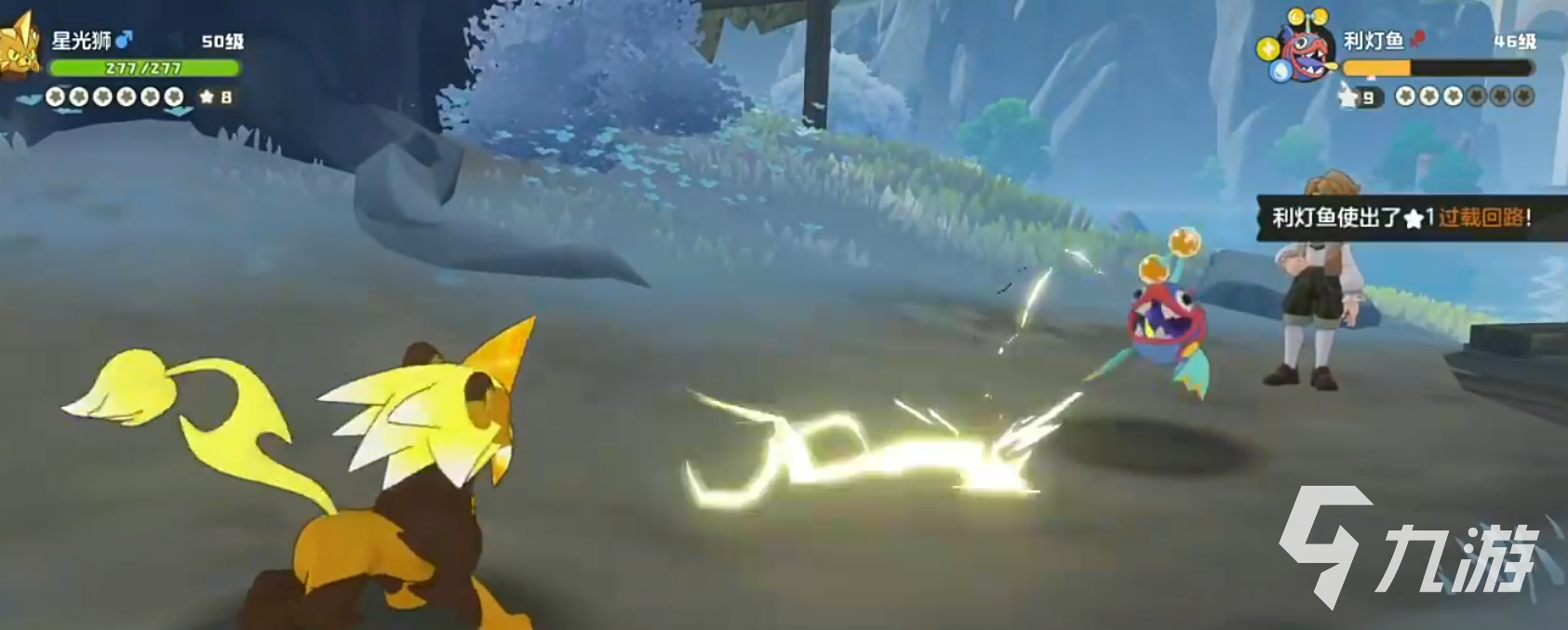 第一战我们要面对的对手是拥有电系加水系的利灯鱼,由于电系之间能相互抵抗,我们可以上星光狮,使用两发2星技离子火花就能击败,接着他上阵的第2位是水系蓝蝶鲨,电系对水系有克制作用,我们不需要更换精灵,继续一发离子火花就能胜利。