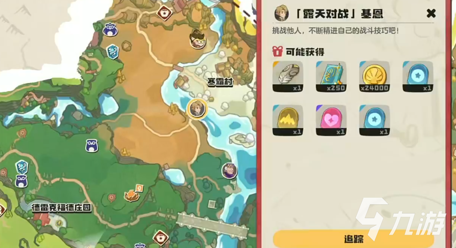 基恩位于寒霜村下方的桥上,各位可以先传送到甜水镇的魔力源,然后直接在地图上通过点击他的头像来实现追踪,让自己在跑图时能获得方向指引,更快地来到他的身边。等各位来到他所在桥上后,一眼就能看到,与他进行交互后便能开启露天对战。各位需与基恩连战两场才能真正赢下他,第一战他会上三只精灵,第二战则是四只,每一战都只需要打倒基恩上阵的全部精灵,令他的魔力值耗尽即可。战胜基恩后,各位可拿到羽毛、普系技能飞踢(三星)、地系技能震击(一星)和萌系技能月光合奏(四星)。
