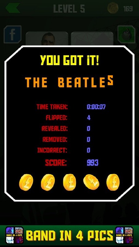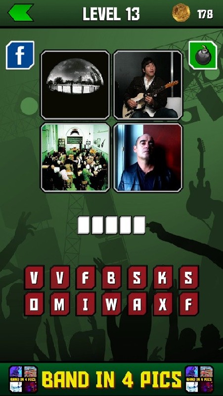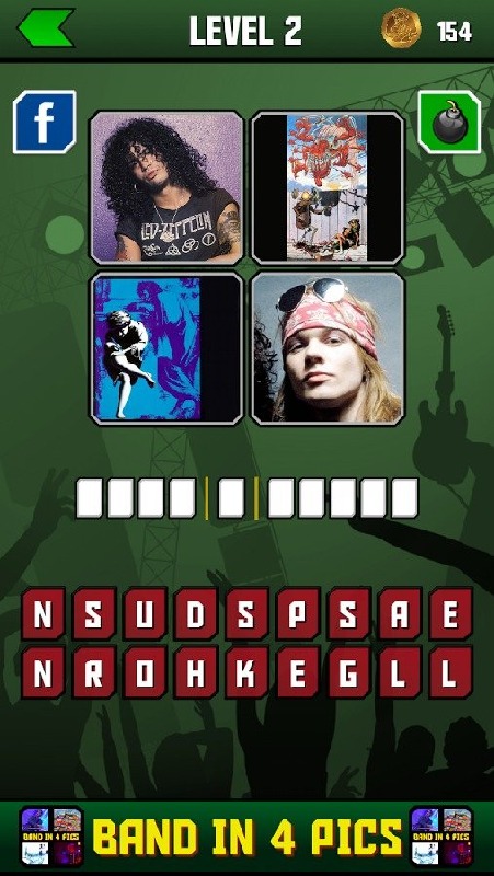 Test your music knowledge! Each puzzle contains four pictures such as band members and album covers - can you get them all? Featuring famous bands across the world from the 60s to the modern day and two game modes to test both the casual and fanatical music fan! If you get stuck you can reveal letters, remove letters from the board, show the origin of the band or post to your Facebook wall for your friends to help!