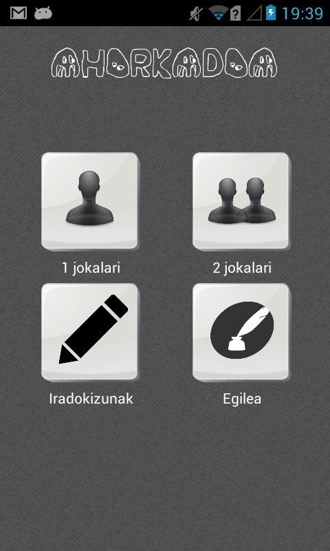 He tenido que poner como predeterminado idioma español por no poder poner Euskera. En unos días publicaré la versión de este juego en castellano. Si NO LA QUIERES en Euskera no te la bajes ya que solo está en este idioma.Euskeraz:Ahorkado joku klasikoa baina kasu honetan euskerazko bertsioan 1000 hitz baino gehiago eta 24 gaiz osaturik dagoela. (Gai eta hitz gehiago joango dira gehitzen denborarekin)Jokuak jokalari batentzat edo birentzako aukera izango du. Jokalari baten arloan, hitz bat ausazko edo gaia aukeratuta aatzea da emandako saiakera kopurutan. Bi jokalarien kasuan, lehen jokalariak pista bezala gaia eta aatu beharreko hitza idatziko ditu ondoren bigarren jokalariak aatu beharko duelarik.Aurki gaztelaniazko bertsioa jarriko dut, itzulpena egin ondoren.Español:El ahorcado, juego clásico que está en la versión en euskera con más de 1000 palabras y con 24 temas. (Se irá añadiendo más temas y palabras a medida que se va actualizando).El juego está compuesto por dos modalidades, la que corresponden a un jugador y dos jugadores. Respecto a la opción de un jugador, tendremos que acertar una palabra elegida aleatoriamente entre todos los temas por la aplicación o mediante la elección de un tema.En dos jugadores, el primer jugador introducirá la pista y la palabra a acertar, para luego que el segundo jugador tenga que acertarlo dentro de los intentos dados.En breves, se subirá la versión en español.