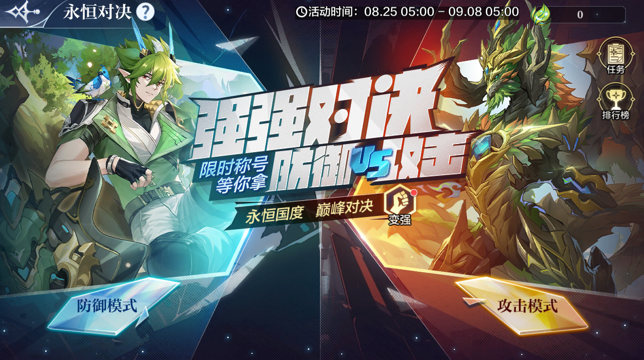 活动内容:永恒对决分为两种模式:防御模式、攻击模式,两种模式有各自不同的挑战加成;