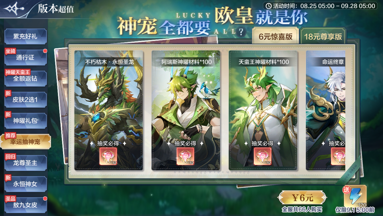 活动内容:奖池更新!【生命王者·阿瑞斯】专属神曜材料*100、精灵【不朽枯木·永恒圣龙】、【战神·天蛮王】专属神曜材料*100、精灵【命运终章·梵瑞】、精灵【万物恩泽·界皇】加入,欧皇的天选时刻等你来见证~