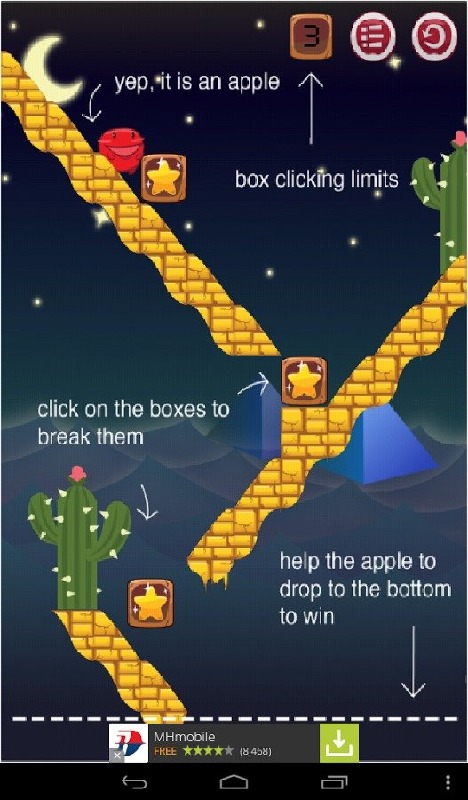 Apple Escape is an addictive game that challenges you to drop an apple through a series of uneven floors with doors at the exits. Watch out the red apple which may be roll over to a wrong path and you need to take action to redirect it in order to complete the game stages. Your task is to escape from the wrong door and take action to click on the right block. Apple Escape lets you start at first stage when with ease. Once it is escape (completed) you need to take action to unlock another stage. Each stage has its own difficulties and obstacles to unlock. Upon completion at respective stage, it will unlock the next stage until you reach stage 9 to complete the game play.How to play the Apple Escape Game?- Once the game is downloaded and installed, click on the right arrow icon located at the bottom right of the start page.- You have a limit of 3 clicks to drop the apple until it reaches the bottom.- A single or multiple path are designed as the way to let the red apple to escape to the bottom level.- Each path has opening but s blocked by boxes. It act like a door to each path.- You need to remove the box which blocks the door by clicking on it.- Once the door is open, the red apple will flow through it until it reach the bottom. - Remember you are limited to 3 clicks in each stage of the game. Any click is not reversible.Key features of Apple Escape game are as follows :-- The game has a start page consist of nice customised graphics with Red Apple and Blocks.- A start arrow icon is at the bottom right of the start page.- A stage menu is include to show the number of stages you have completed. Those incomplete state are locked.- The opening page of the game is aeasy to understand instruction to show you “how To Play” the game- When you are ready, click on the circular arrow icon to start anytime- Release the red apple until it escapes through all the stages.It's fun! Never before you ever get a chance to play this easy yet interesting Apple Escape game. Download it now while it is still free !
