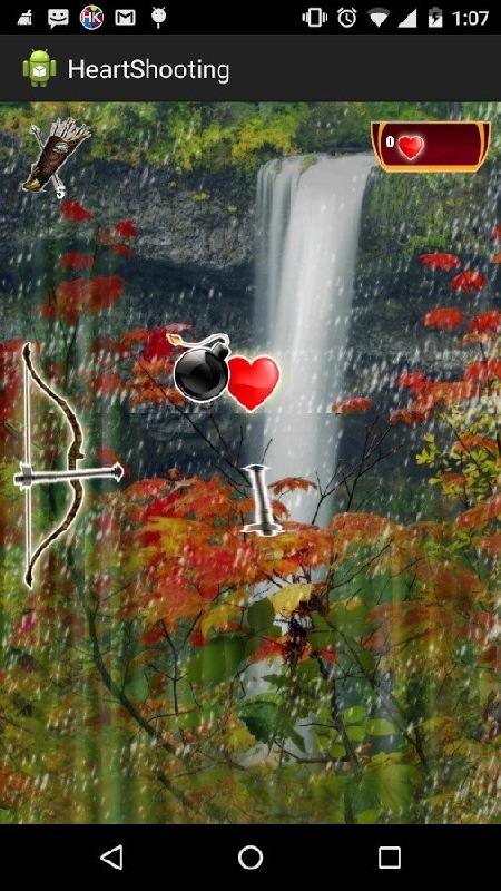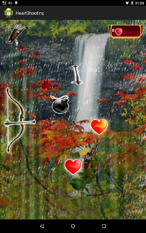 User has to drag and drop the bow. So that the Arrows will get shooted to the hearts.-> If user Shoots the bomb, then the game is over.-> If user shoots the hearts, then points will be added.-> If user soots the arrows, then the number of arrows will get increased and he can use those arrows as On-Up's.-> Good UI, Lokk and Feel.-> User can share his points through various sources to his friends.