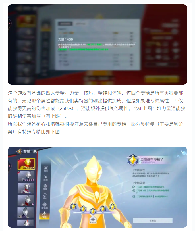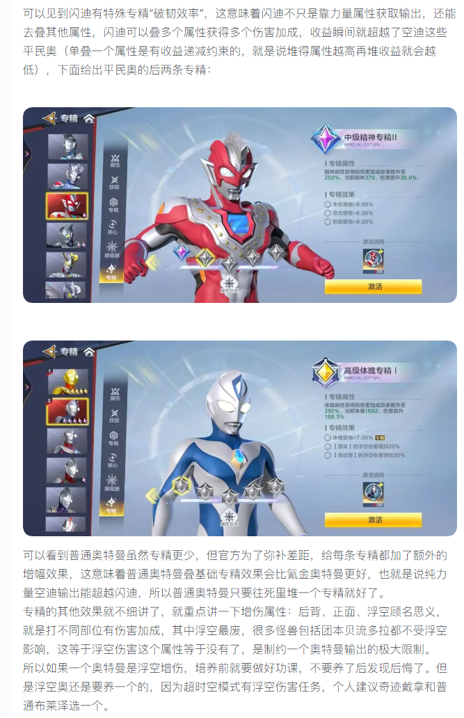 专精是一个奥特曼提高战力上限最重要的板块,一个高专精的平民角色(空迪)能在相同核心和增幅器的情况下输出达到氪金角色(闪迪)的几倍,金5专精的平民角色能秒杀没有专精的氪金角色。平民千万不要养氪金奥特曼,收集图鉴就好了,养平民奥特曼PVE才有体验。