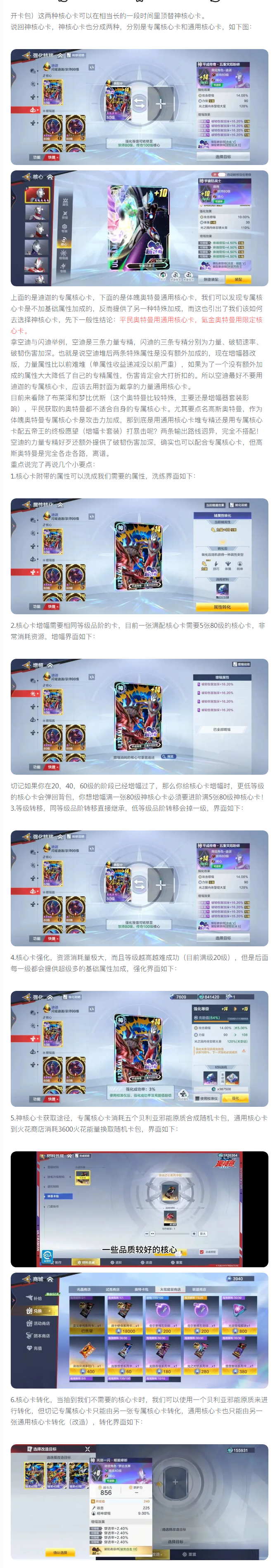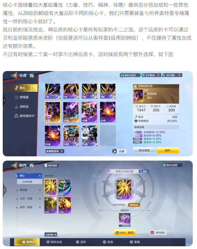本期带来核心卡介绍。核心卡围绕着四大基础属性(力量、技巧、精神、体魄)提供百分百加成和一些其他属性,从20级到80级有大量品阶不同的核心卡,我们只需要装备与所养奥特曼专精属性一样的核心卡就好了。