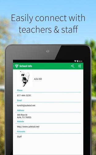 The Azle ISD app gives you a personalized window into what is happening at the district and schools. Get the news and information that you care about and get involved. Anyone Can: - View district and school news - Use the district tip line - Receive notifications from the district and schools - Access the district directory - Display information personalized to your interests Parents and students can: - View grades, assignments, and attendance - View and add contact information AZLE ISD的应用程序为您提供了个性化的窗口,在地区和学校发生了什么事。获取新闻和信息,你关心并参与讨论。 任何人都可以: - 查看学区和学校新闻 - 使用区尖线 - 接收的地区和学校的通知 - 访问区目录 - 显示信息的个性化你的兴趣 家长和学生可以: - 查看等级,分配和出席 - 查看和添加联系人信息