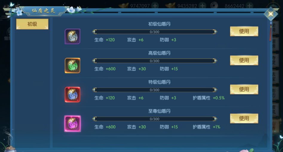此外,使用仙盾之灵灌注仙盾能够快速提升仙盾的基础属性,让你的仙盾拥有更高的起点。