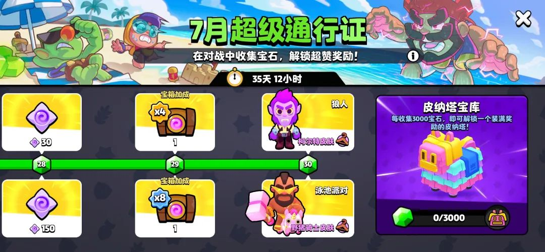 7月通行证将于7月1日0点焕新启程。在对战中收集宝石,即可解锁超赞奖励!启用超级通行证,可获得更多奖励!