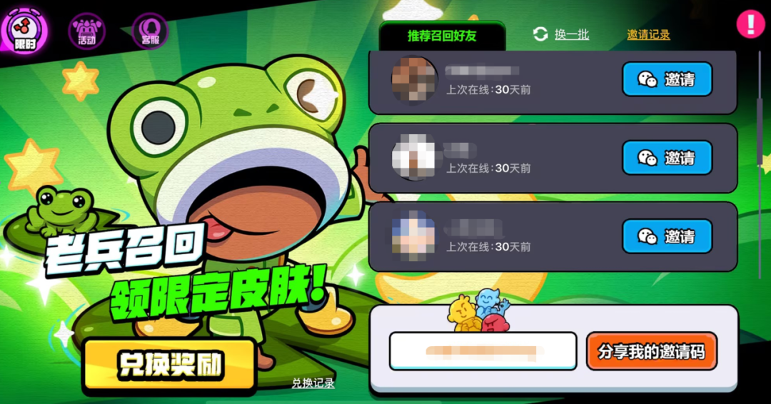 召回同玩游戏好友,可兑换金币、4倍券、8倍券、里昂皮肤等海量奖励