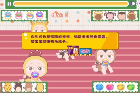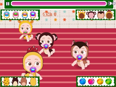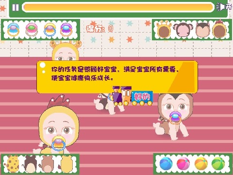 潜入宝贝乐园,让我们一起享受宝贝的天真和烂漫! 你可以为宝贝换上喜欢的奶嘴、宠物帽、花背心和五颜六色的气球,陪伴宝贝健康快乐的成长! 宝贝可调皮哦!宝贝玩高兴了却也是件头痛的事呢!面对宝贝们五花八门的要求,你将如何应对呢!