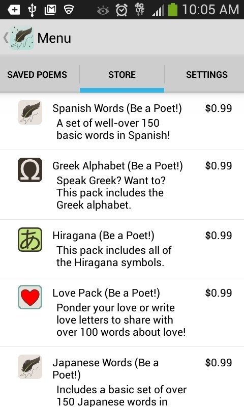 Be a poet is the kind of app that changes according to your mood. Use it to relax and to meditate. Let it help you brainstorm ideas for your next project. Or just have fun! How does it work? To play, just drag word tiles onto your play suce to create poems, write messages, or begin a story. You can save your new creations or share them with the world! What can I do with it?Meditate.Writing can be a type of meditation. Instead of just sitting still, try using Be a poet to write whatever comes to mind for a set period of time. You'll be amazed what you'll discover about yourself!Brainstorm.Be a poet can be used to start a new project or help break writer's block. It has rewards to keep you writing, and the packs of words inspire you to think about story ideas in a different way. If you're not a writer, you can brainstorm party themes or creative projects.Learn.Use the non-English alphabet packs to start thinking in a new language! Share.You can share images of your poems with others. Write a sonnet to a loved one or a funny note to a friend and send it as a text message, an email attachment, or on twitter.But really, at the end of the day Be a Poet is as individual as you are. What you do with it is up to you!What's included?The complete application is included, along with some basic decks such as: English Alphabet, Basic Words, and Adjectives and Adverbs. It also comes loaded with fun packs like Science, Shakespeare, and Wild West.What are the in-app purchases for?The in-app purchases are for extra decks, including decks for other alphabets such as Hiragana, Katakana, Greek Alphabet, and Russian Alphabet. There are decks for basic words in other languages, such as Basic Spanish, and Basic Japanese. There are also extra fun backs for enhancing your creativity, like Romance Novel, Love, Pirates!, and more.