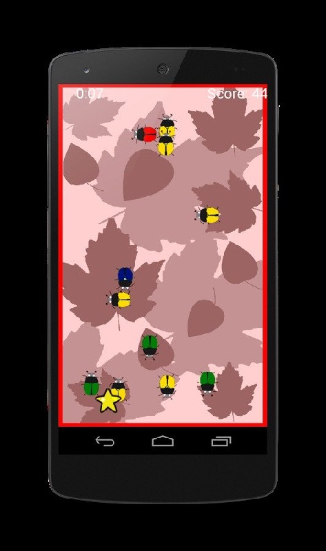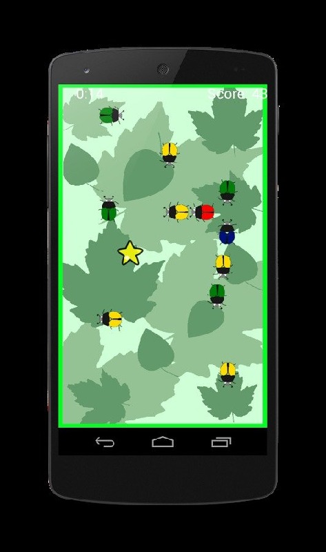 Funny Bug Hunt on the screen. Crushed beetles to earn points. But caution it must be the right bugs (beetles are available in four different colors). For the correct beetles there are additional time added to the countdown, for false killed beetles give it penalty seconds.