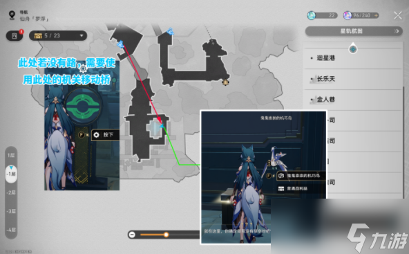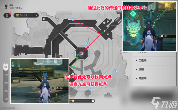 2、玩家与机巧鸟对话,会让玩家找纸条,之后传送至幽囚狱(1层),“勘录舍·栈道前”锚点,按照如图所示,首先使用传送门穿行至高处平台,在高处平台可找到光点,调查后可获得纸条;