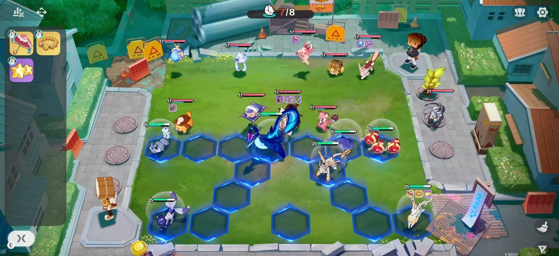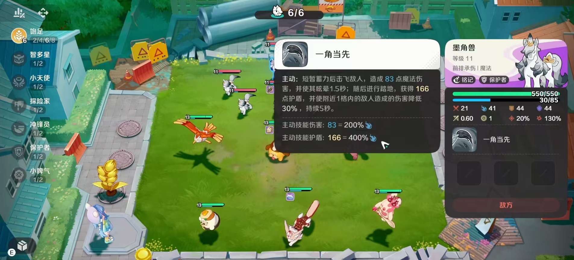 在位置方面,墨角兽是属于前排承伤角色,因为它的特性是保护者,这一类型的精灵都是坚固的前排肉盾,伤害类型属于魔法,元理是铭记。技能一角当先,在经过短暂蓄力后击飞敌人,造成魔法伤害,并使其眩晕1.5秒。随后墨角兽进行踏地,获得护盾保护自身,并使得附近一格以内的敌人造成伤害降低30%,持续5秒钟。