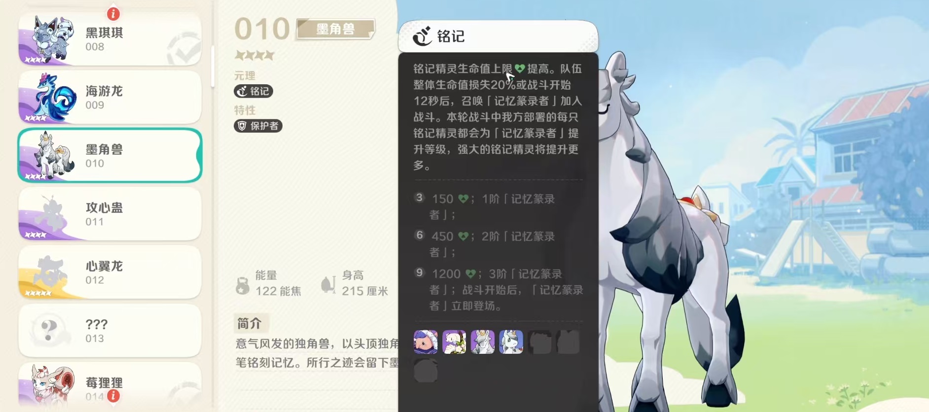 在羁绊搭配方面,墨角兽的元理是铭记,相信大家对铭记比较熟悉,这是一个可以召唤出强大召唤物记忆篆录者的独特效果。场上铭记精灵的数量越多,召唤出来的生物也就越强大。目前铭记状态下精灵数量比较多,所以较轻松的就能够达到满羁绊的程度。如果要达到满值,战斗开始后召唤物直接登场,强度非常高。