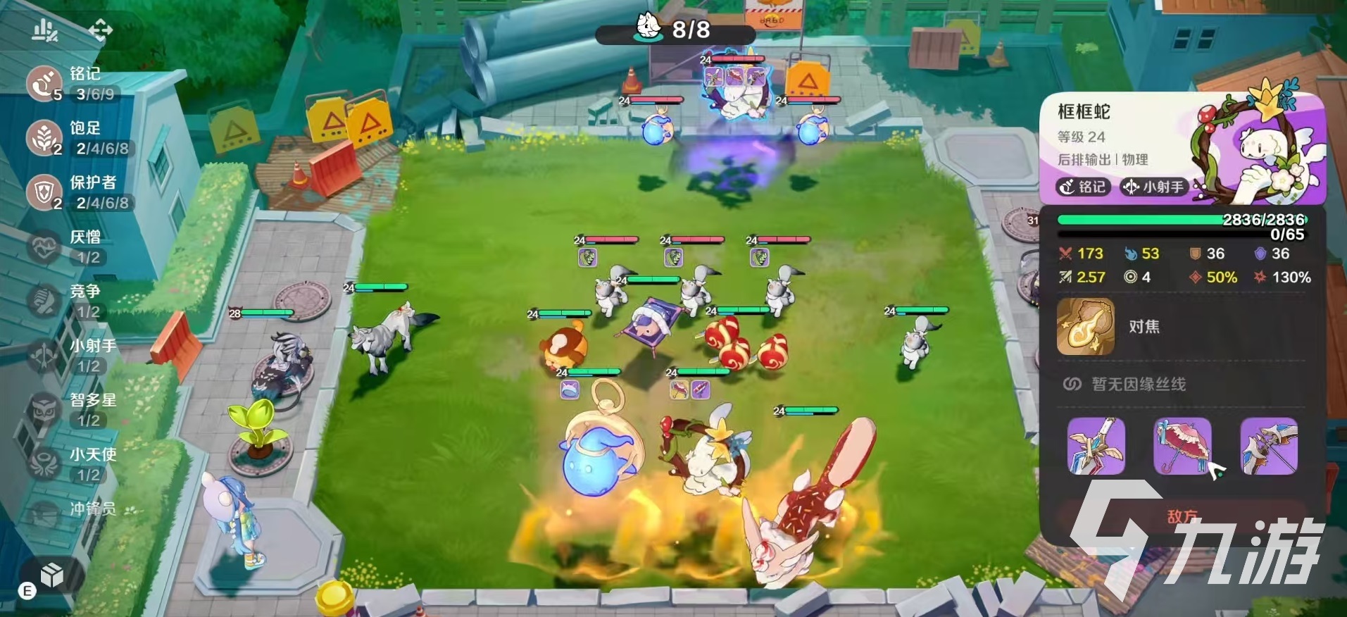 框框蛇是属于后排输出类型的精灵,它的伤害类型为物理伤害,自身的元理是铭记,特性是小射手,这个特性就决定了框框蛇就是在后排打输出。所有小射手特性的精灵攻击力都能得到额外的加成,如果和攻击目标之间的距离比较远,大于两格,加成还能进一步提高。如果能够触发更多羁绊,例如达到八羁绊效果,就有40%攻击力加成和100%额外提升效果。