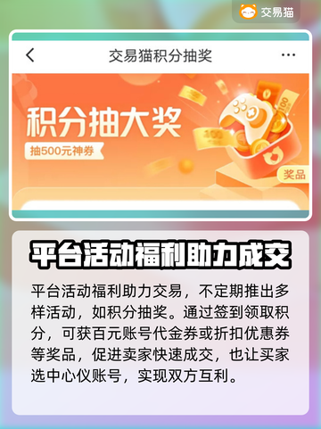最近在交易猫上卖游戏账号,真的超方便!✨我是大逃杀游戏的忠实玩家,跳伞、搜集装备、战斗求生是我的日常。但换新号后,旧号怎么快速出手成了难题。后来用了热卖推荐,曝光率直接起飞!📈很多游戏都能覆盖到,买家一眼就能看到高性价比账号。平台还有抽奖活动,签到就送积分,能抽折扣券和代金券,太香了!💰