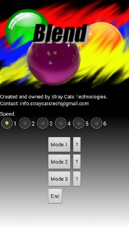Match primary colors together to form secondary colors to match dropping spheres from the top of the screen. Click each of the spheres before they make it the bottom of the screen or before their countdown reaches zero.Each successful touch of a sphere awards players with 1000 points.If sphere reaches the bottom, players are penalized with -10000 points and possibly a random color change.If sphere 's countdown reaches 0, players are penalized with -5000 points and possibly a random color change.Spheres drop according to music. Game comes with a default song but players can change the song to whichever song they have on the device.Sphere drop speed can be configured to 6 different speeds.Reach for a highest score possible before your song ends.Send feedback to info.straycatstech@gmail.comFuture Wishlist to app:- More colored spheres that will drop- More modes to choose from- Powerups