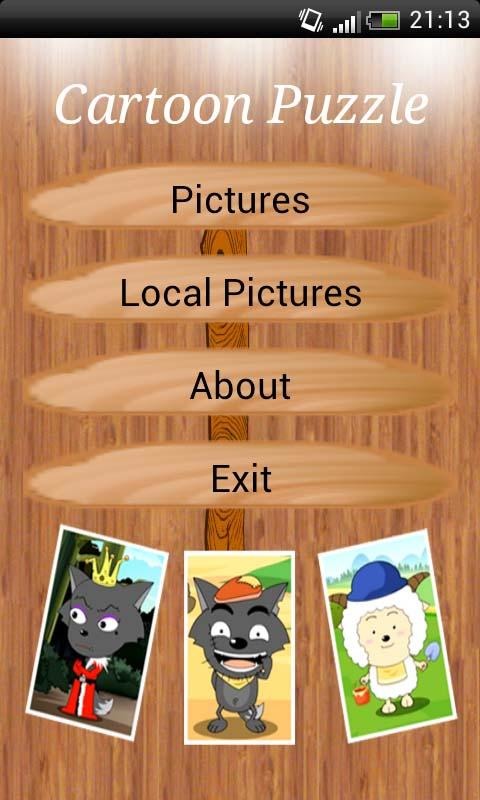 Cartoon puzzle is a casual puzzle game. We have various kinds of cartoon pictures, such as xi yang yang, hui tai lang and so on. You can select one of them and enjoy yourself. Of cause, you also can scan pictures in you own phone or SDcard and select one of them to enjoy yourself. Come on, we wish you have fun ! Cartoon Puzzle
