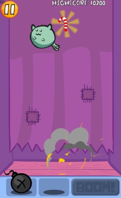 Mova as bombas com o dedo e aperte boom para explodir os gatos, e pegue os doces