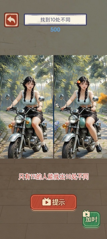 这是一款以 “极致细节观察” 为核心的休闲益智找茬游戏,凭借精致画风与巧妙的差异设计,成为碎片时间里既解压又健脑的热门选择。 每关都会呈现两幅视觉高度重合的精美场景图 —— 从复古摩托旁的少女装扮,到湖畔小镇的生活细节,画面融合了写实质感与二次元美学,人物神态、环境物件都刻画得细腻鲜活。你的任务是在相似画面中精准定位 10 处差异:这些不同藏得颇 “心机”,可能是少女发间的装饰、摩托的配色,也可能是背景里的一朵花、湖中的小鸭子,甚至是远山的光影变化,每找到一处都能收获满满的成就感。