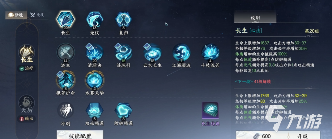 另一种是长生心法,更偏向于远程治疗,此时使用武器为伞,表现出女子的温婉柔情。能通过一系列技能给友方提供治疗效果,恢复生命值,延长战斗续航和生存,技能以柔克刚,是战斗中比较重要的支援角色,她们都拥有较高的生命上限,善于恢复,利用护盾吸收伤害,比较克制“阴系”心法。
