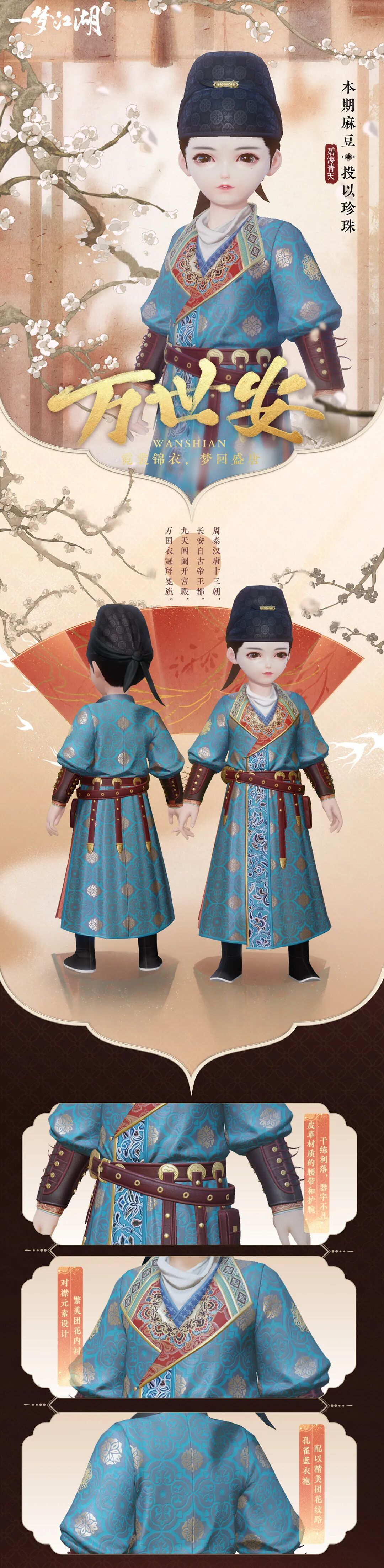 男款则一袭孔雀蓝的衣袍,照着唐朝的流行趋势翻开了对襟,露出绣着繁美团花的红色内衬,精致中又透出几分侠客的潇洒!