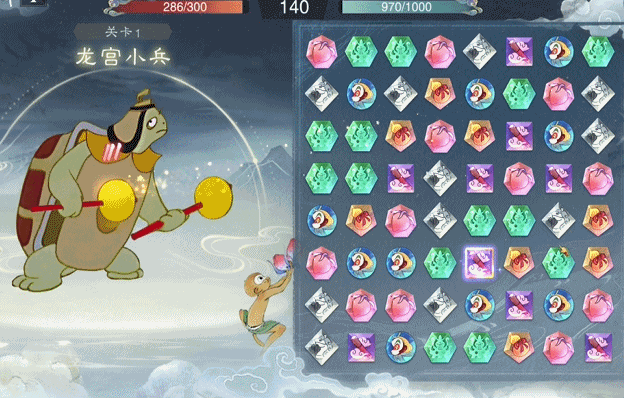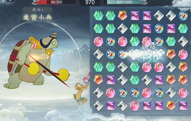 少侠进入玩法界面,眼前棋盘分布着各类“法宝”,轻指推动,纵横捭阖,使三枚及以上相同图案的棋子相连,即可迸发神通、累积积分并给守关天神一次攻击,击败守关天神即进入下一关卡。