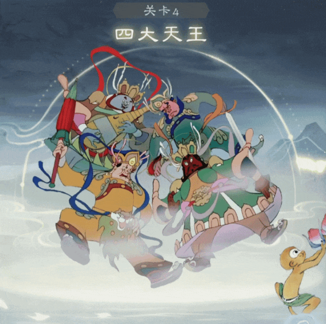 增长天王持剑、多闻天王执伞、持国天王抱琵琶、广目天王握蛇,【四大天王】各有神通!"我们四个,你打哪个?"