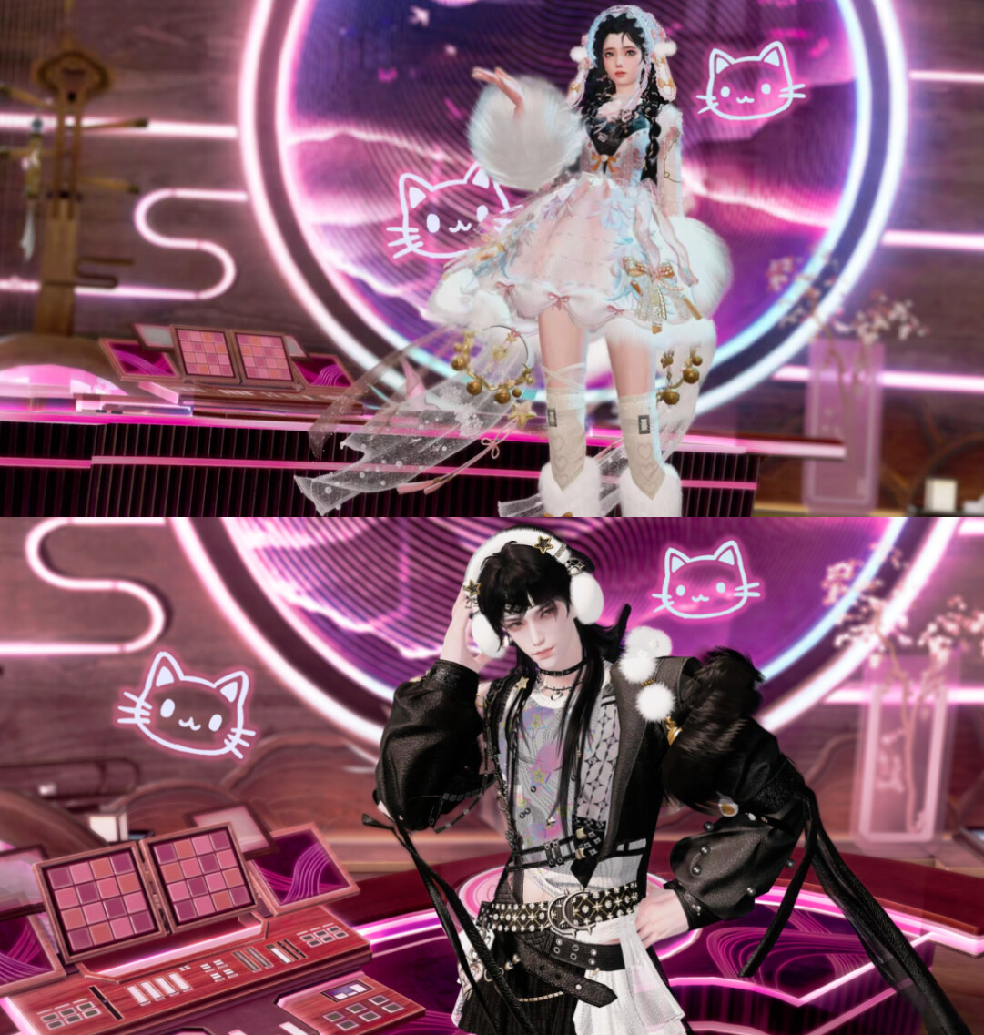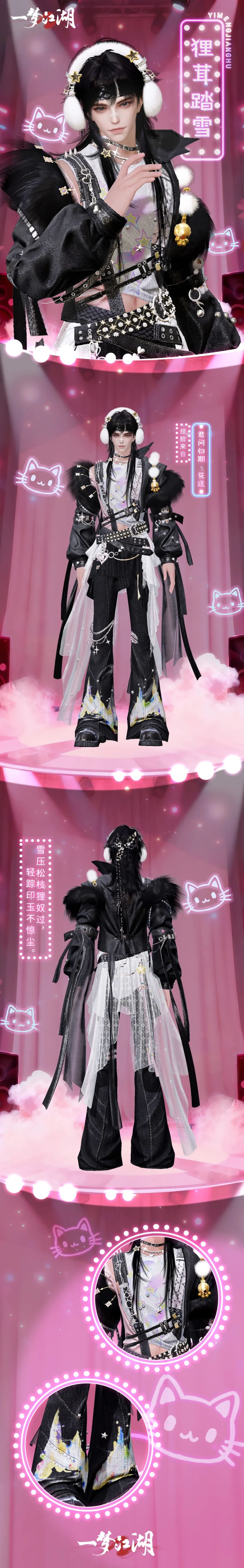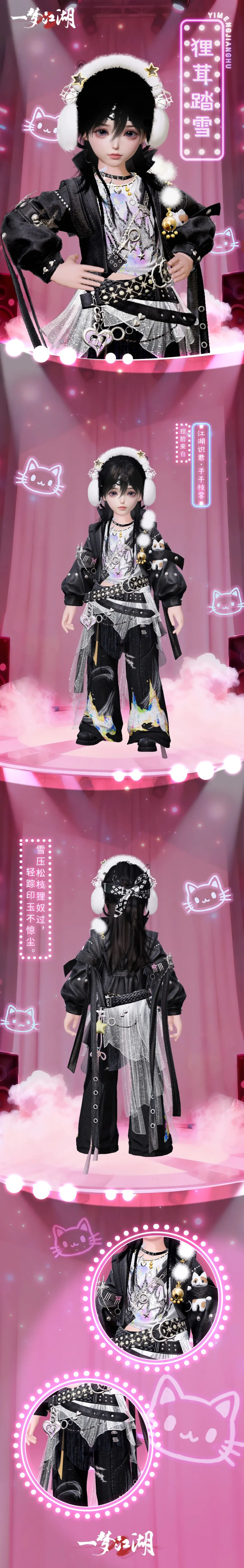 男款以粉白搭配墨黑,时装剪裁灵感来自时下流行的舞台元素,慵懒间暗藏潇洒。肩头吉他带斜挎不羁风华,摇曳处似拨动乐器时的低鸣余韵。衣摆泼洒的暗纹与霓虹光绘交织,金属链饰碰撞出摇滚的清脆节拍,毛绒耳罩覆于墨发,如狸奴蜷卧暖炉边的惬意姿态。