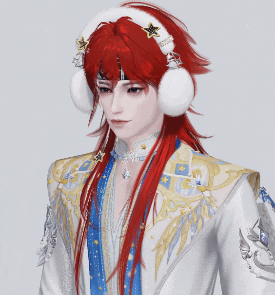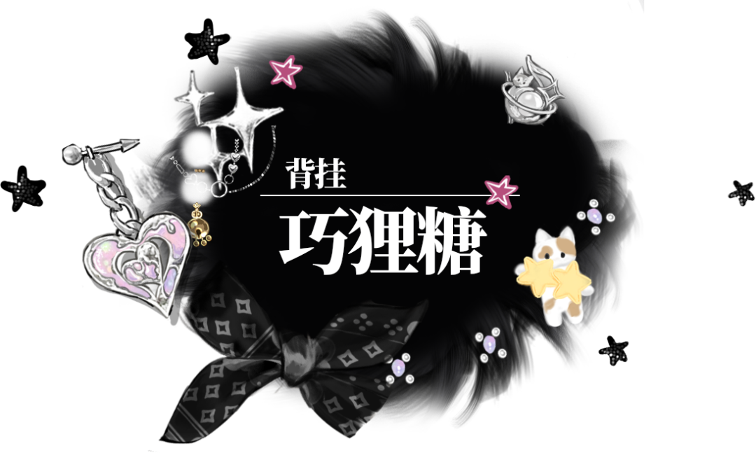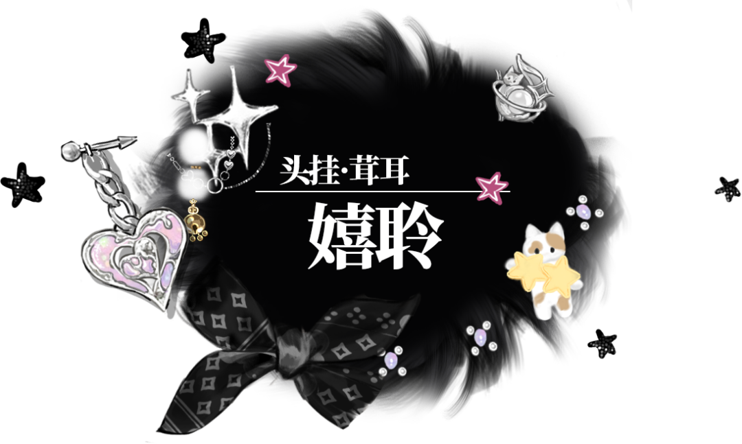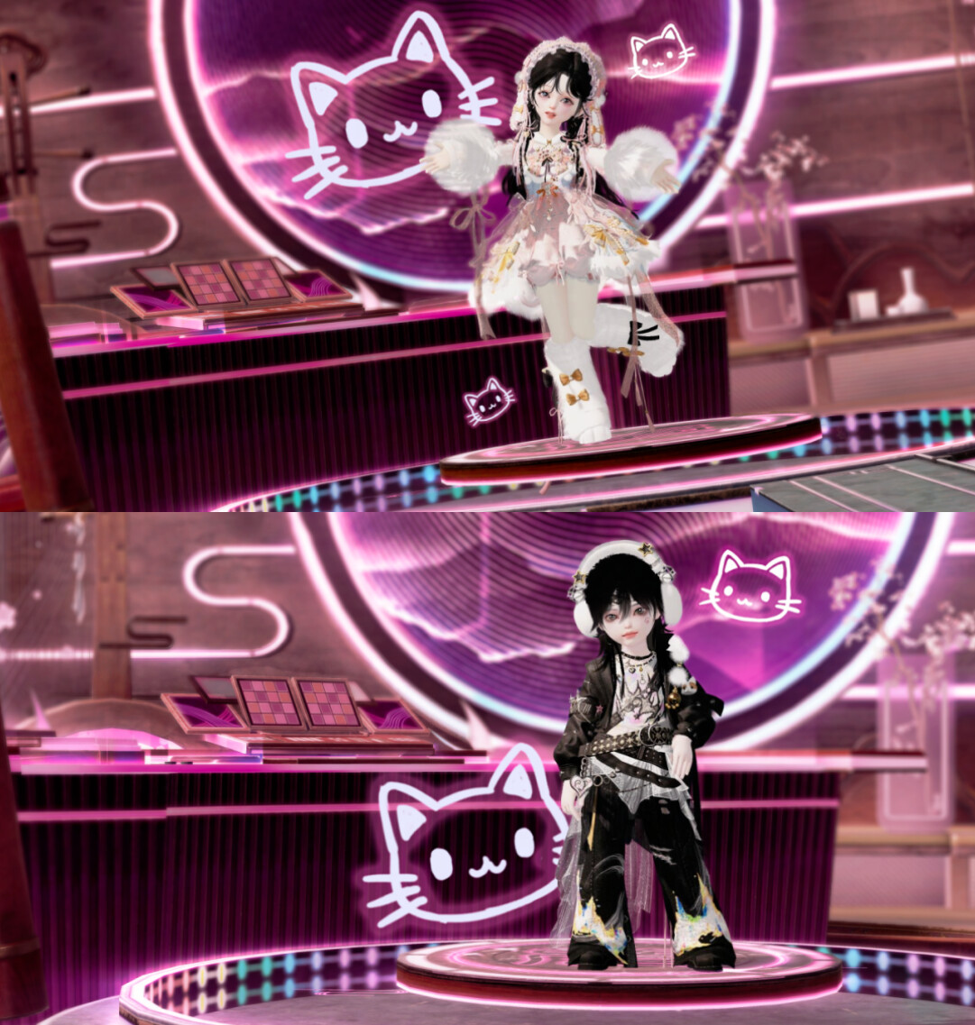 男款以粉白搭配墨黑,时装剪裁灵感来自时下流行的舞台元素,慵懒间暗藏潇洒。肩头吉他带斜挎不羁风华,摇曳处似拨动乐器时的低鸣余韵。衣摆泼洒的暗纹与霓虹光绘交织,金属链饰碰撞出摇滚的清脆节拍,毛绒耳罩覆于墨发,如狸奴蜷卧暖炉边的惬意姿态。