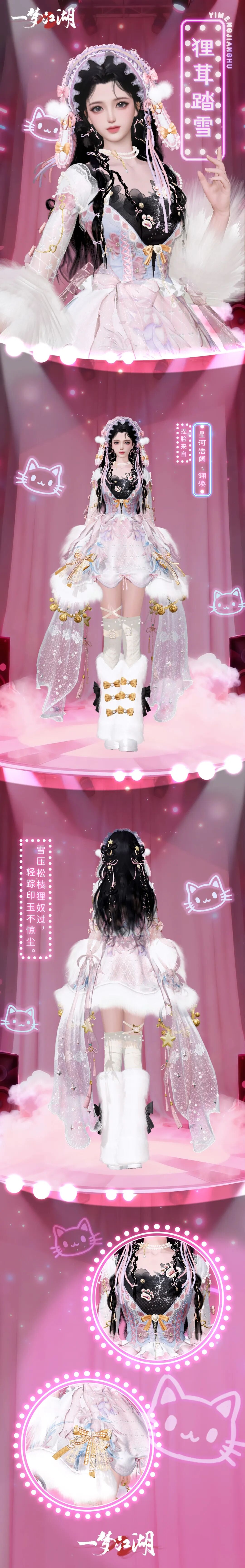 凑过去一瞧才发现,原来是云锦楼小分队正在进行新装上线前最后的路演彩排!站在少侠面前的是身穿三花猫设计元素行头“时装·狸茸踏雪”的少侠!这套时装从猫界大美人三花猫的喵系美学中获得灵感,玄色间雪白,搭配一点亮眼的黄色,色彩和谐,可盐可甜~原来这就是猫界美人的顶级美貌吗!出门这么穿,直接化身人群的焦点,成为万众瞩目的大明星!