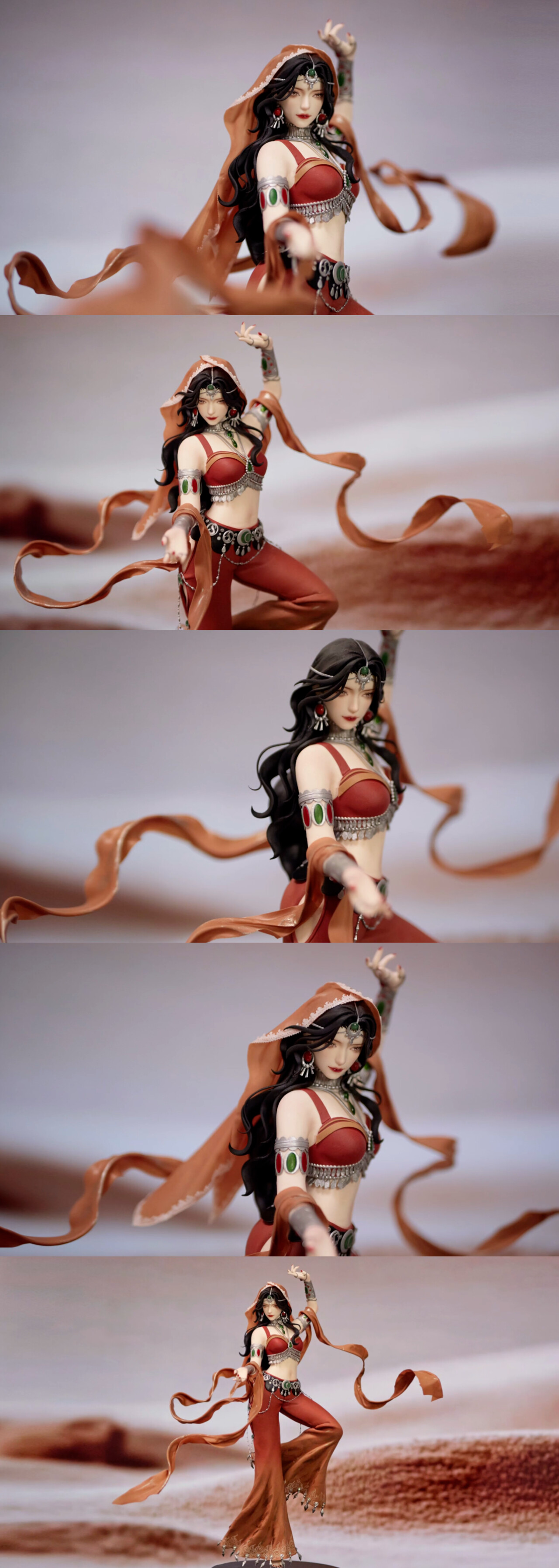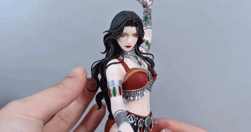 取西域落日染就的绯色黏土裁出缀满星纹的异域短衫,银丝掐出腰链流苏;层叠轻纱覆成灯笼裤形,踏出月牙泉的涟漪;十指塑成拈花妙相,腕间镂空雕琢;黛青画眉如远山含雾,唇间点染石榴朱色,双眸盛着月牙泉的水光,发丝压出大漠波浪~
