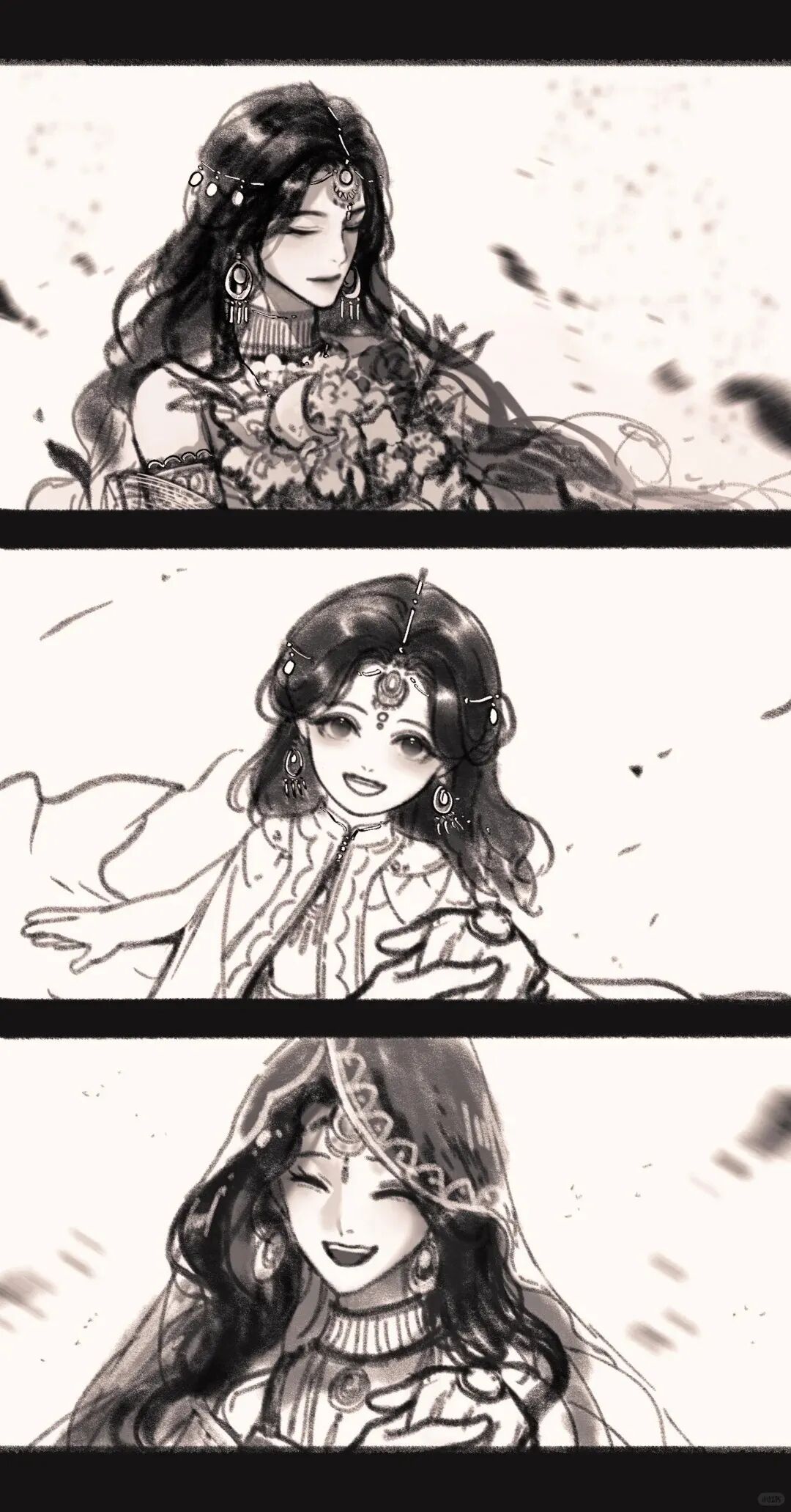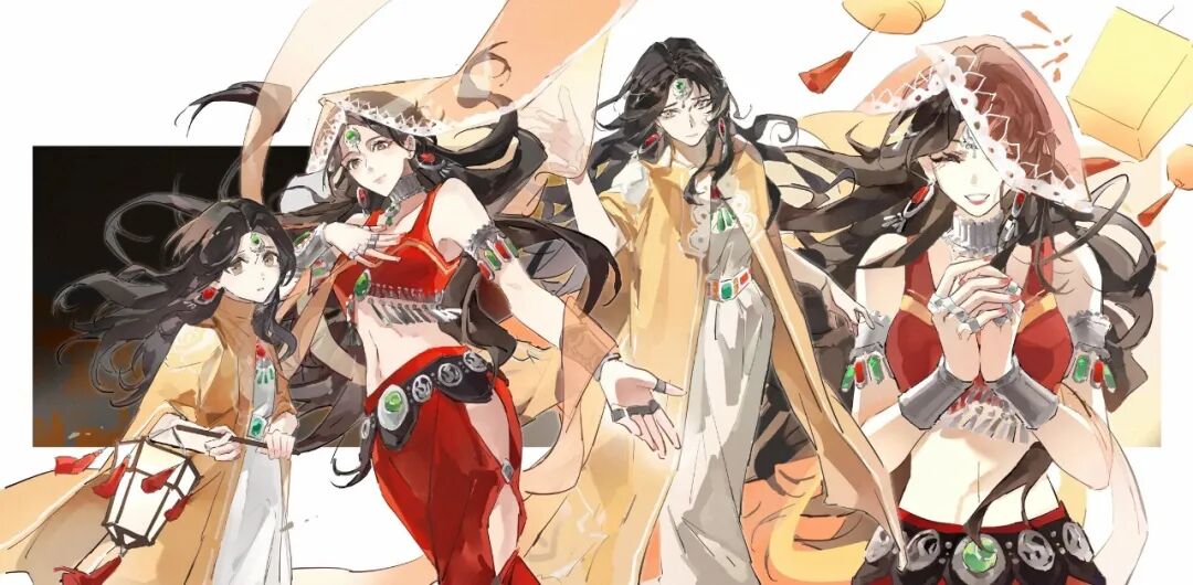 第一笔落在幼年,灯笼轻晃,她提着半盏摇碎的星光,眼底盛着比沙漠更深的茫茫;第二笔染及豆蔻,头纱缀满异域弦歌,翩翩起舞时旋起金沙如雨;第三笔绘至加冕,华服压住稚嫩的肩头,她在楼兰望向远方;第四笔劈开时空枷锁,她闭目合掌,灿烂日光在睫毛上跳舞,此时的阿法芙明媚而张扬,让江南烟雨悉数淋过她扬起的嘴角。