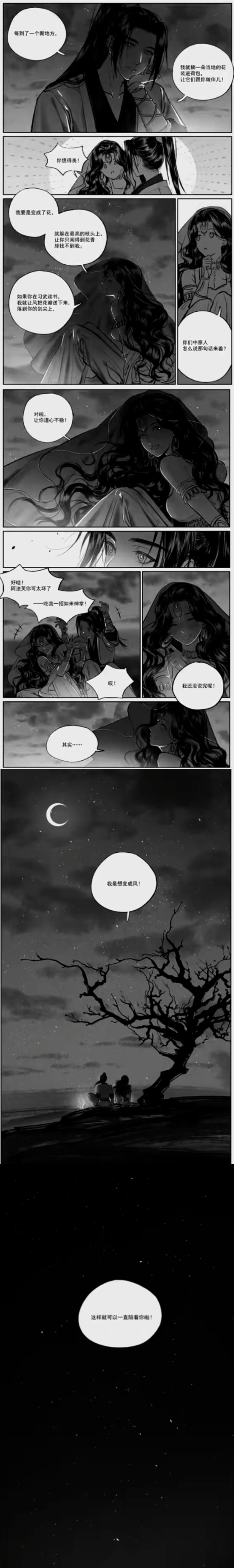 若不做黄金乡的主人,不做阿法芙,便能随少侠走遍曾说过的远方;若阿法芙是一把刀,那定是西域寒光凛凛的宝刀,被少侠背在身后,斩破风沙、闯荡四方;若是一棵草、一朵花,那就收进香囊荷包,贴近少侠心口,一同去天涯。