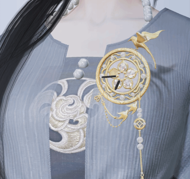 胸前的青鸟装饰,象征着远航的深海;前领的纱沿褶皱,形如白色的贝壳。整体以鸢尾花金饰、宝石流苏点缀,宽大蓬松的毛领更添华贵。这些随着丝绸之路传入中土、又经西洋艺术点化的精巧饰物,在衣襟袖口间巧妙排布,既保留了东方特有的韵味,又为整体注入一抹令人眼前一亮的新潮之美。