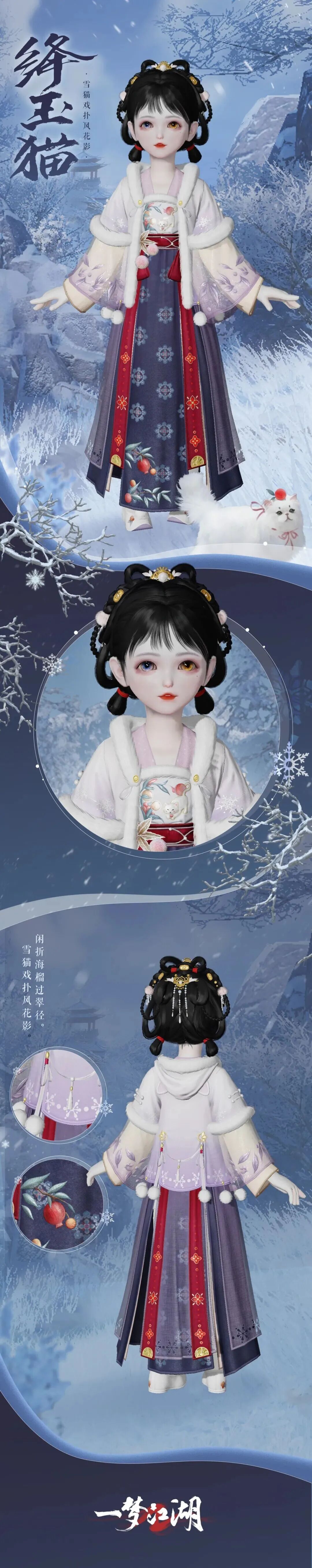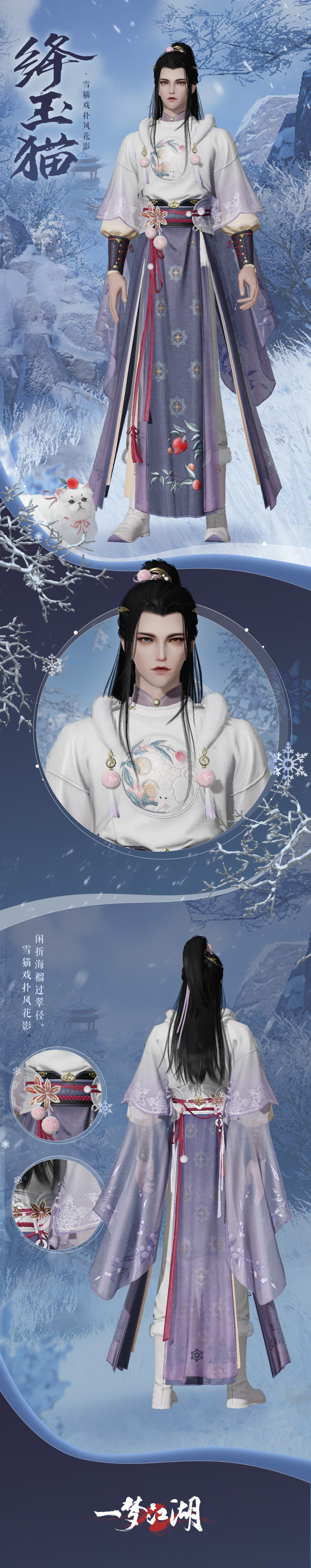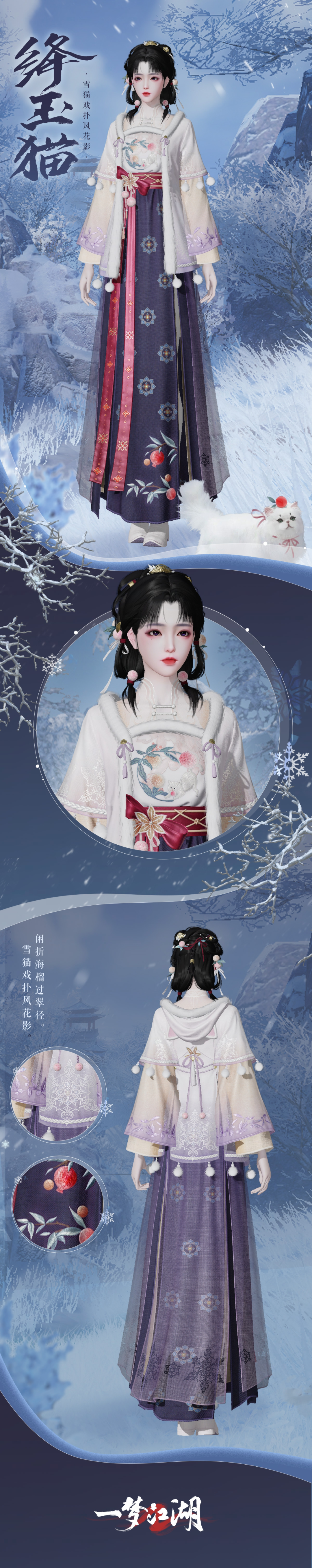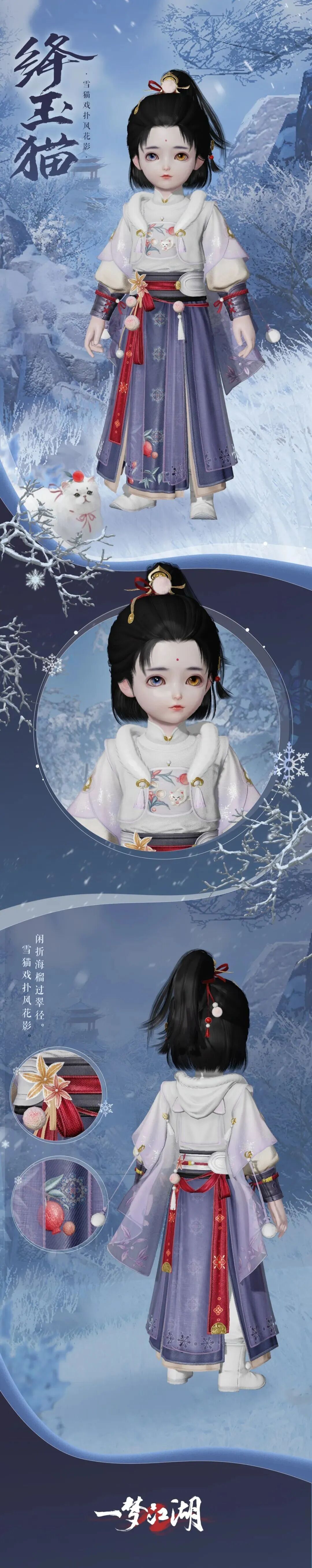 为纪念这一幕冬日趣景,大师傅精心设计了保暖又精致的全新时装·绛玉猫,将小猫玩冰果的可爱一幕细绣其上,期待每一位少侠穿上时装时,都能感受到生灵可爱,冬日温柔。