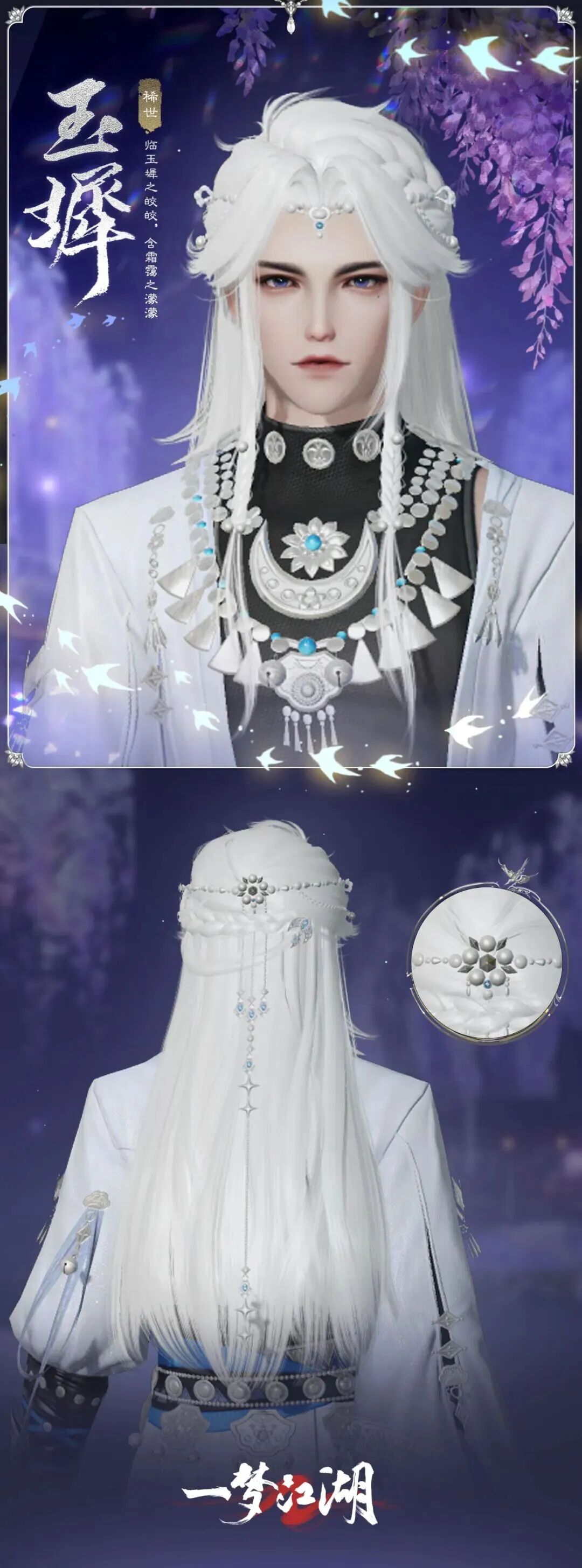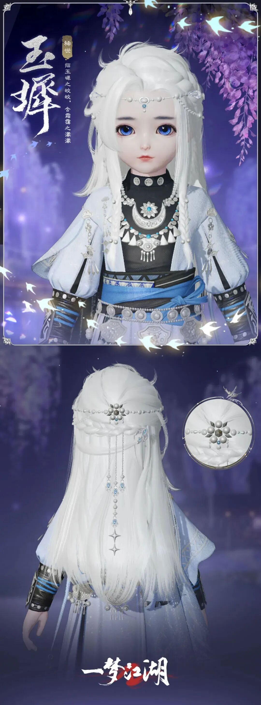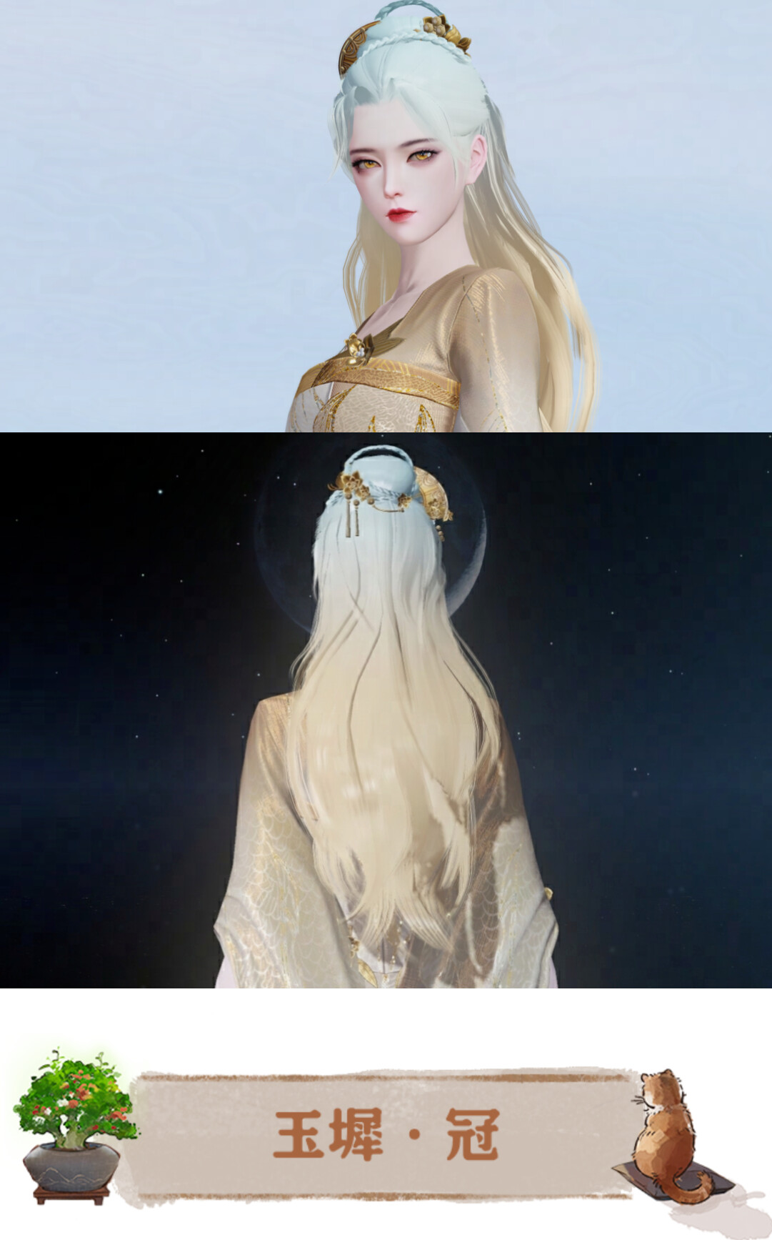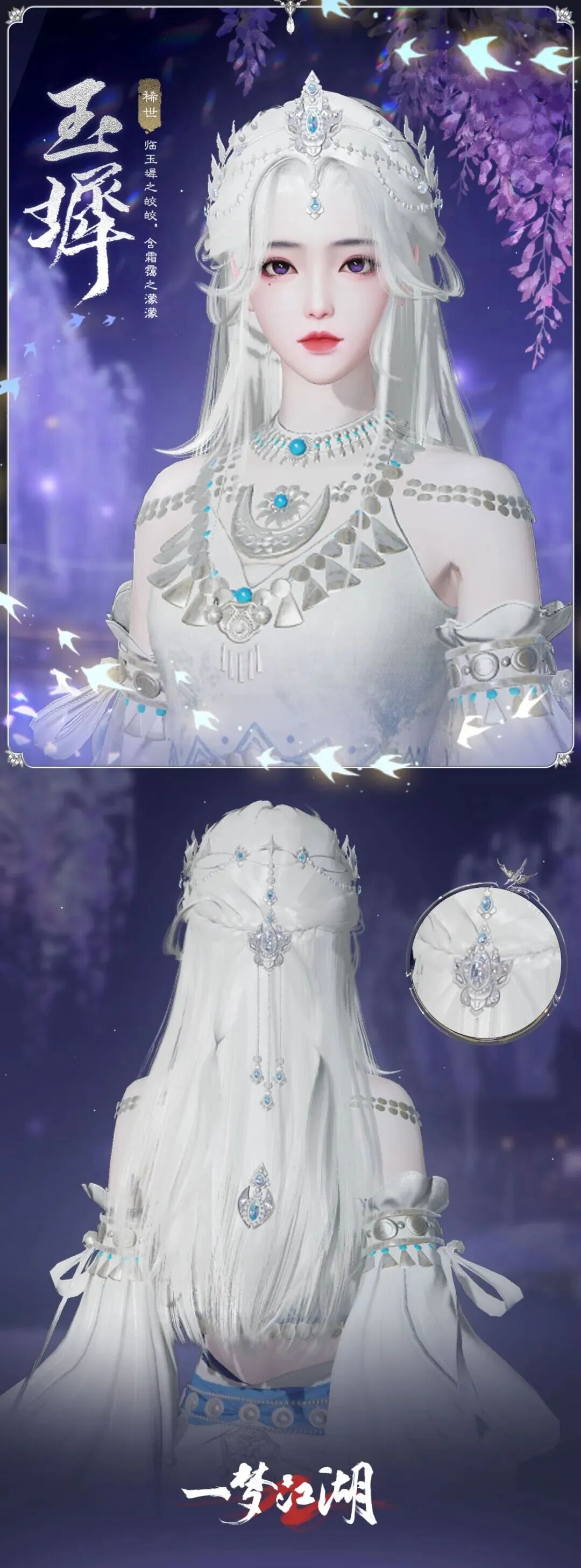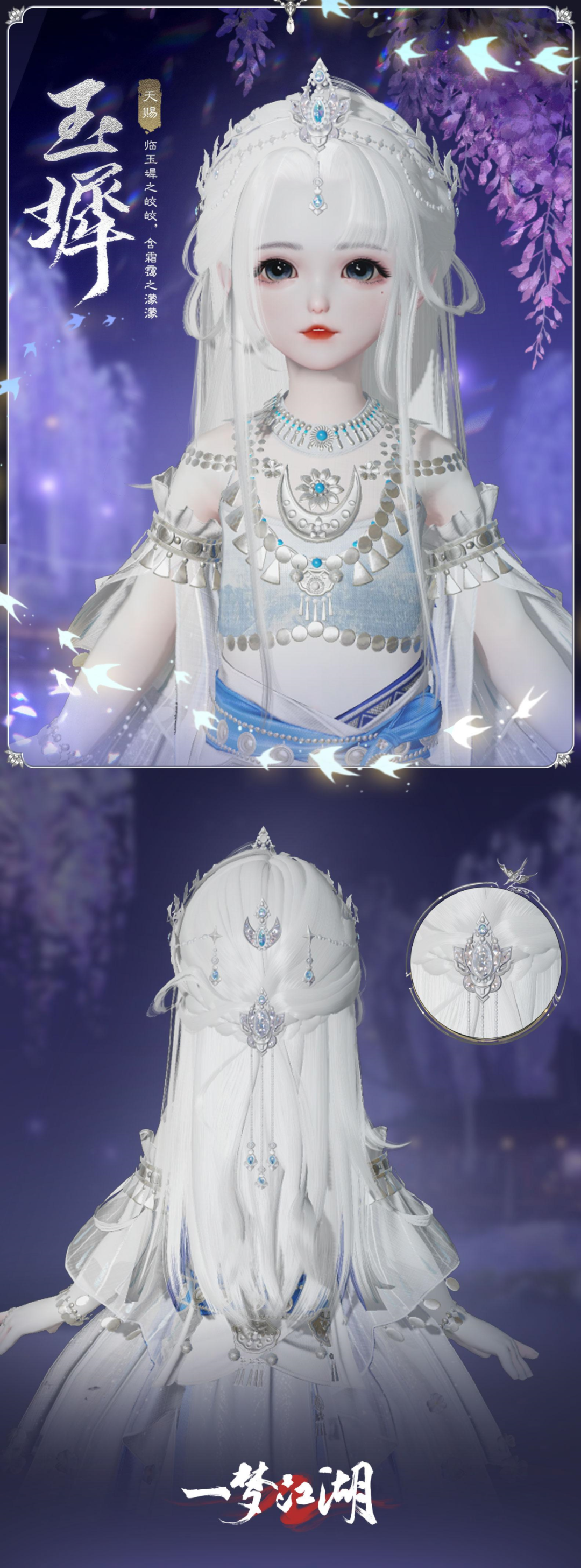 玉墀·冠取自秋夜濛濛月色,皓白发丝宛若皎皎月光下莹白玉墀。发间点缀着的碧蓝色宝石,在月光下熠熠生辉,恰似秋夜天边繁星点点。莹白珍珠与湛蓝宝石点缀在白发间,处处细节都彰显着雍容华贵、超然脱俗。