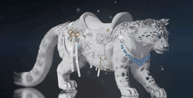 全新双人坐骑·天山踏雪以雪豹为设计原型,湛蓝的豹瞳宛若两颗精美宝石,神秘且迷人。但目光却锐利有神,不由让人心生敬畏,身上装饰着靛蓝色宝石与精致装饰,方寸间尽显王者风貌。