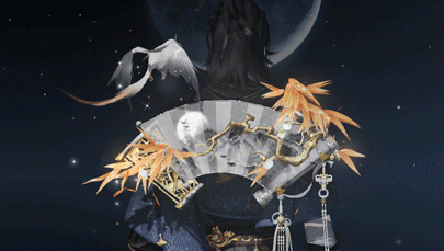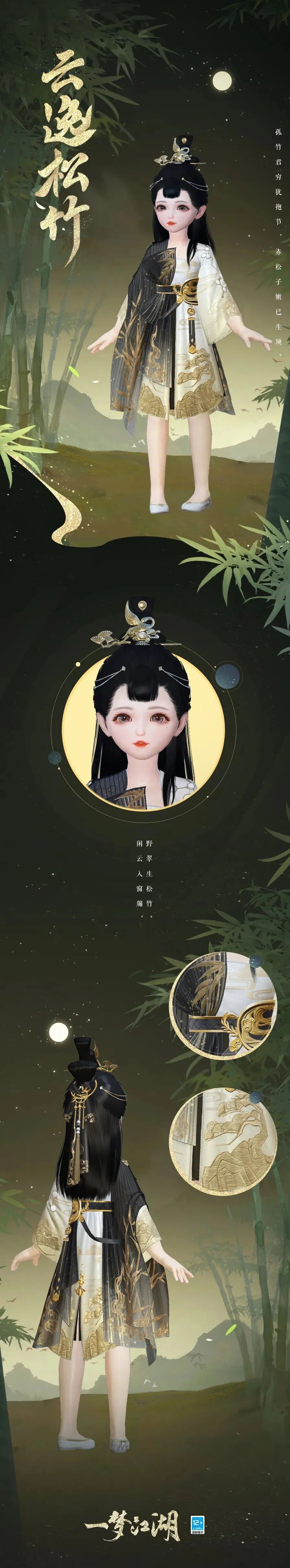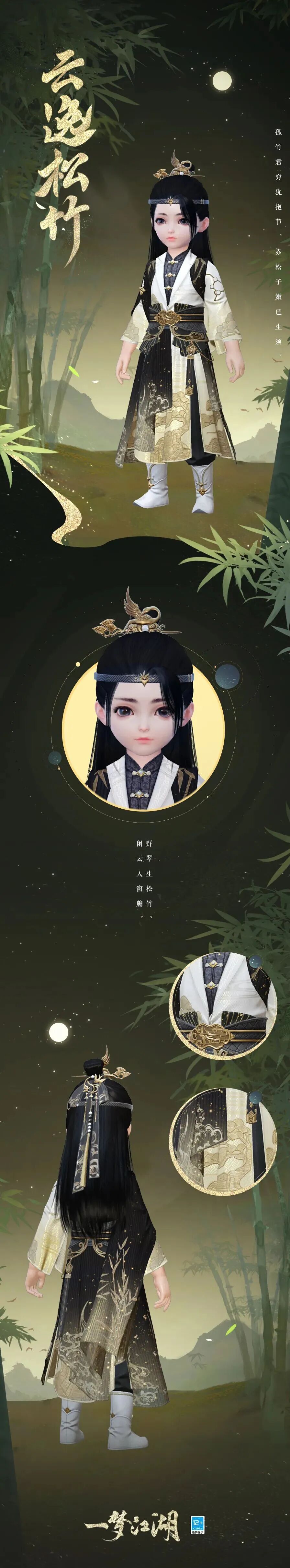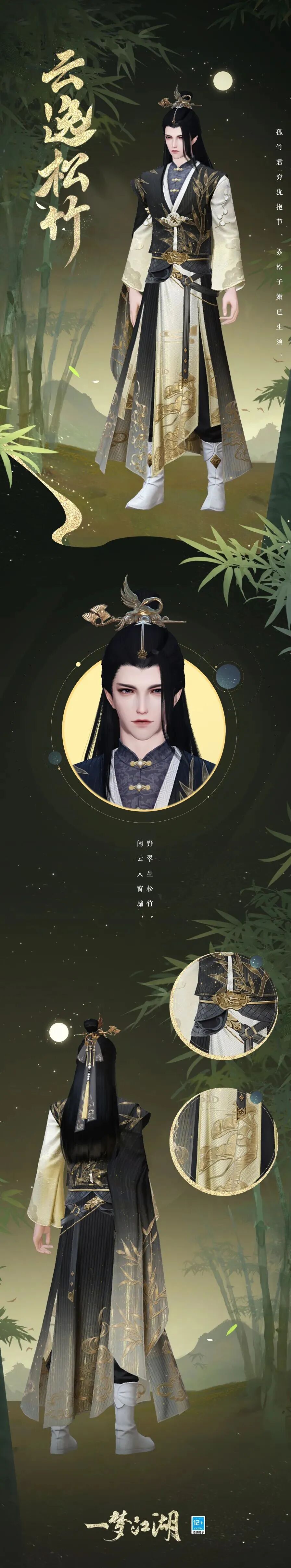 少侠以金质松鹤发冠半束墨发,不对称的黑白衣袍上以暗金丝线绣出松竹纹样,前襟以云形白玉盘扣拢起,宛若皓月映祥云自竹林松巅而出,更衬少侠的侠心与浩气。