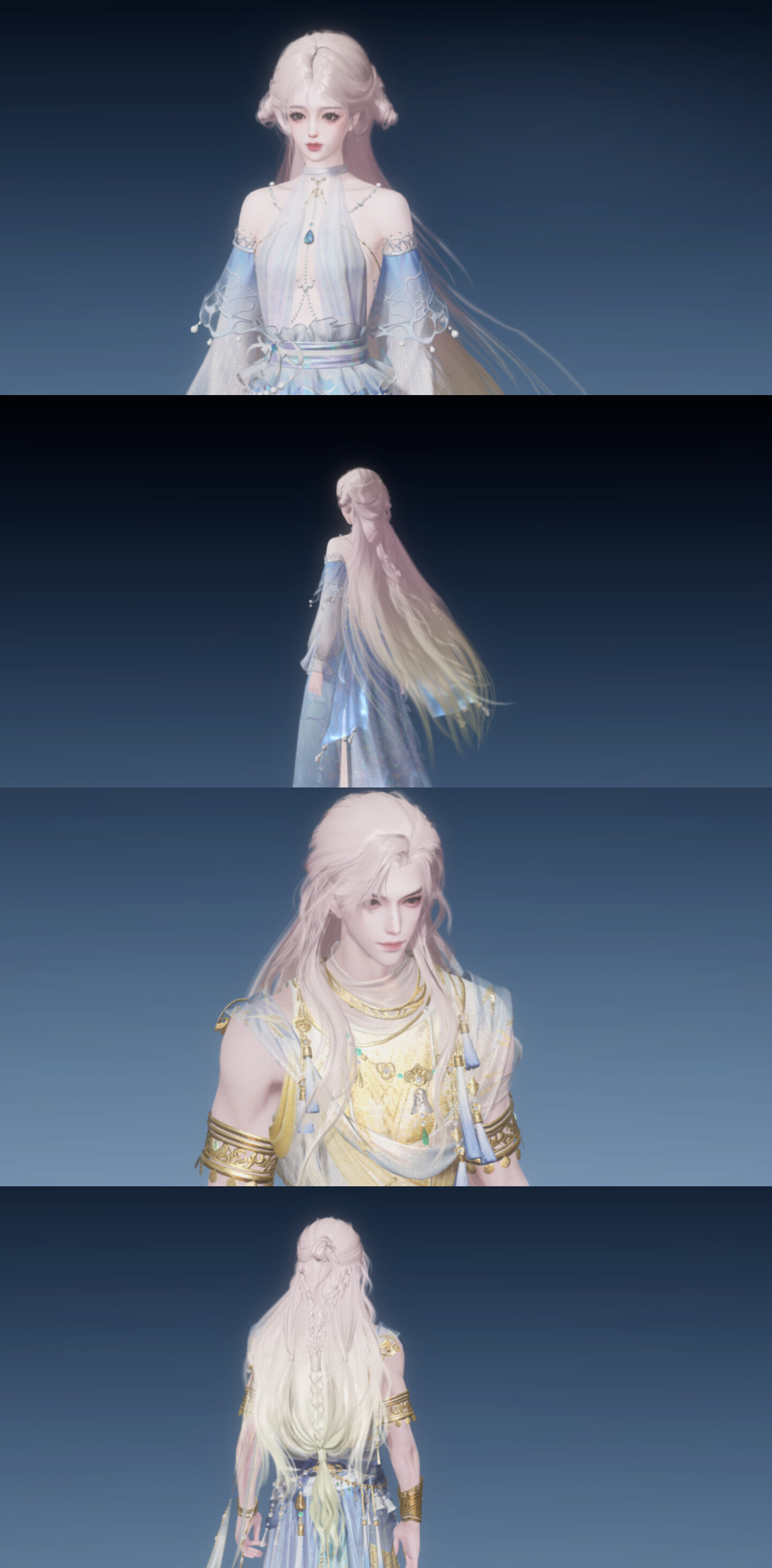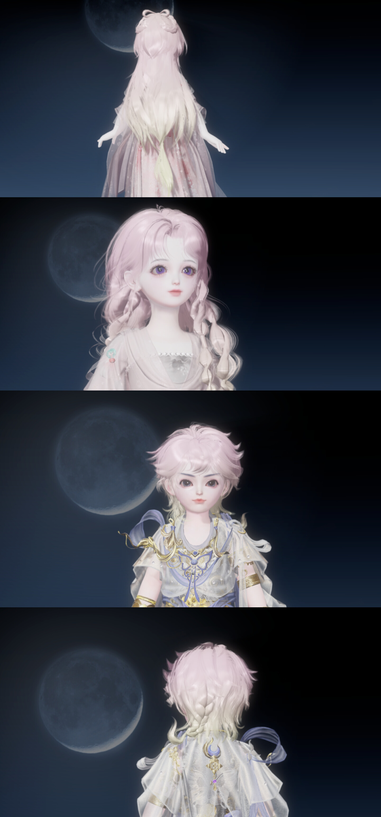 桃青发色可由渐彩膏·粉蔷与渐彩膏·苍金两种色彩染就,两款染膏可在12月26日开启的神盘觅珍中获取。粉蔷段似霞光中的胭脂云霭;苍金段若新叶抽芽时迸发的青碧。光影流转间流淌着生生不息的暖意。
