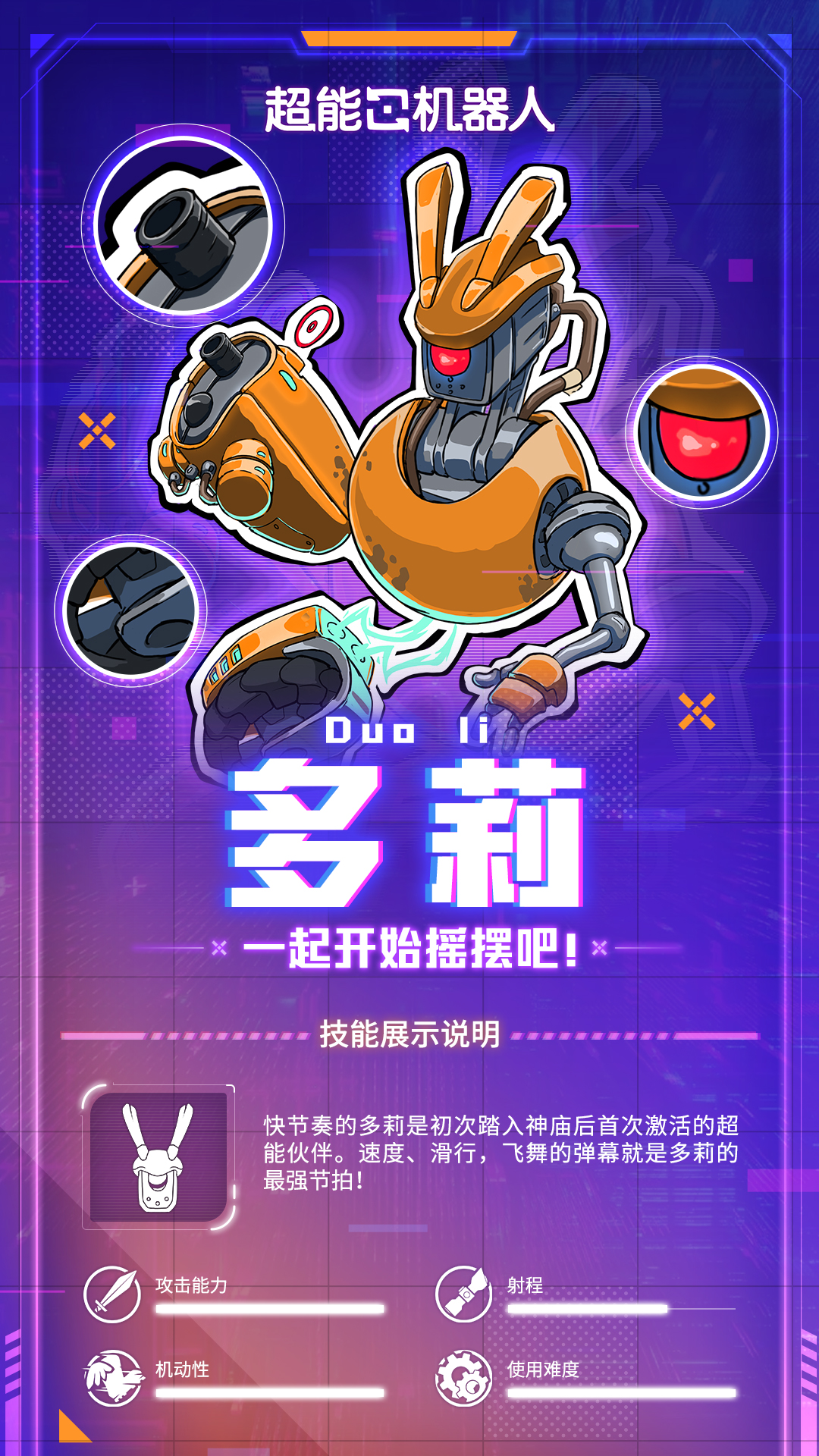 《超能机器人》是一款侧重于弹幕类的俯视角射击Roguelite动作游戏。玩家将扮演塔亚——克罗布探险家和救世主,勇敢地反抗邪恶计划。在这征程中塔亚并非孤身一人,他被一位超能机器人选中,获得了能够变身成为那些古老机械生物的能力。每位超能机器人都有它们独特的战斗方式和特殊能力,去尝试并根据你最喜欢的战斗风格选择升级路线。积攒能量在两个角色之间切换,收集芯片提升武器改造上限,创造出拥有无限可能性和多样协