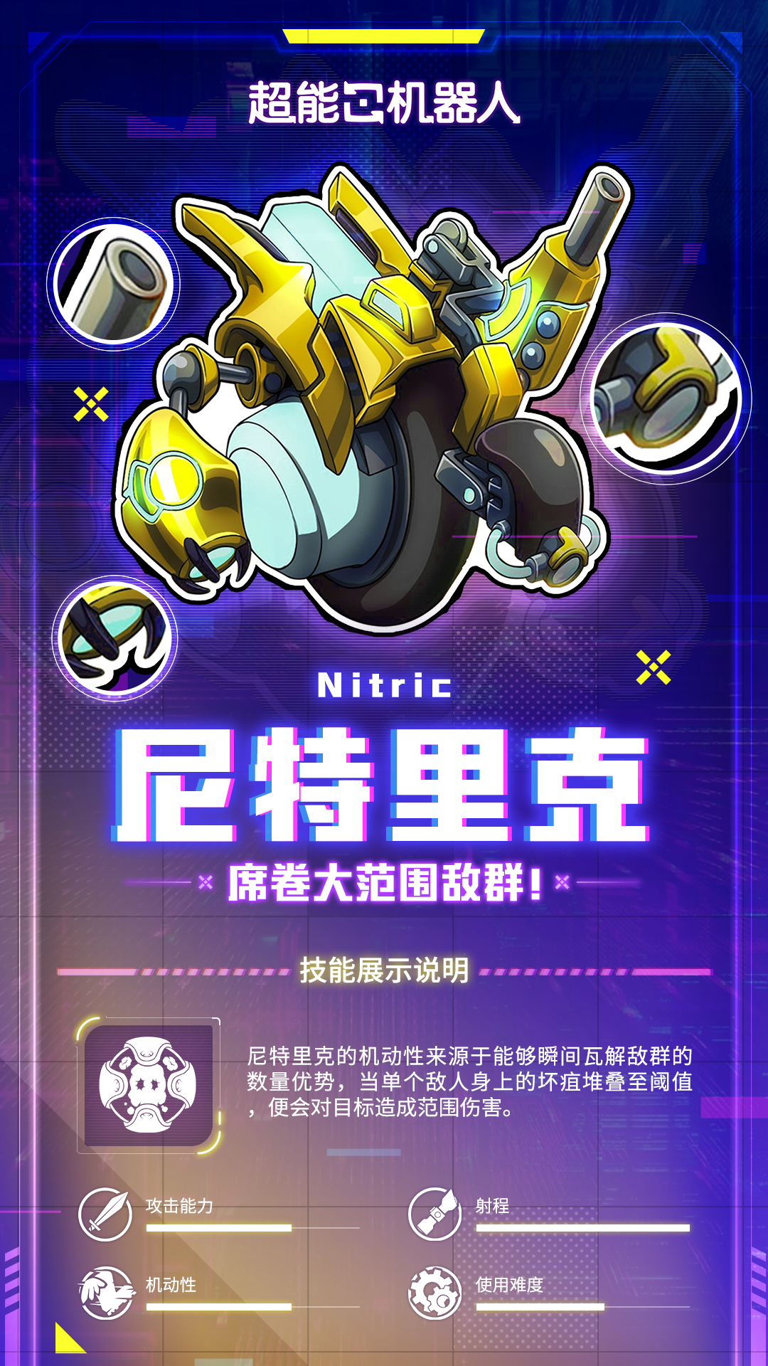 尼特里克是游走于战场的机械猎手 —— 它的子弹能够对敌人造成机械「坏疽」效果,当这个效果在积攒到一定阈值后,就能在敌人周围发生爆炸,从而对附着效果的敌人造成范围伤害。它从不依赖瞬间爆发,而是用“点的坏死”撬动“面的崩塌”,让敌人在个体的绝望与群体的恐慌中同步瓦解。