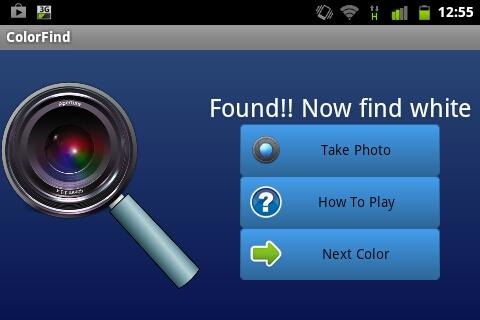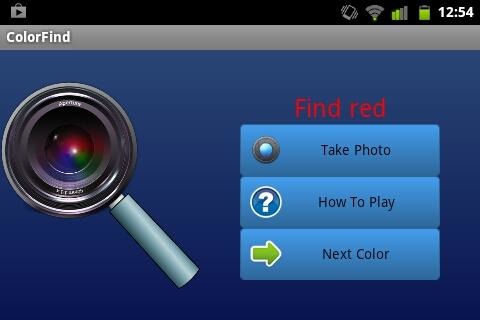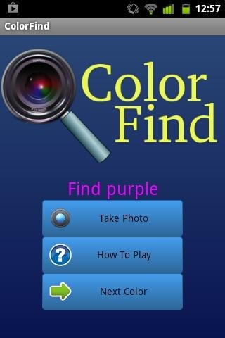 Play Color Find - a game you play with the world around you.Color Find is a game where you must take a photo with a specified color in it. If the color is in the photo, the app will say Found and given you a new color to find. The game seems easy at first, but you can make it as hard, and as interesting as you want it to be. Try playing in unique areas, such a while driving (as a passenger), on a hike, in the mall, at school, etc.Tips:If the app says the specified color is not in the photo, and it is, try adjusting your camera settings, especially exposure, color balance, or any specialized modes. It is a good idea to play the game in good light or outdoors.The app is designed for phone sized screens, but can be played on a tablet just fine, although there may be sizeable blank space. Device must have camera; works with all cameras, and uses the default camera application.--------------Known Bugs: When changing orientation in camera app, return to Color Find causes an error, requiring the user to skip color and go to the next. Does not crash.