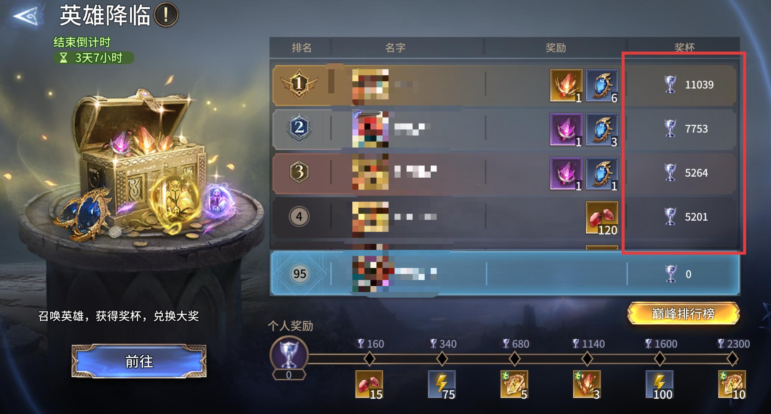 进入游戏主界面 → 点击 【神谕之征】 → 找到 【英雄降临】榜单活动 → 查看活动介绍召唤英雄,赢得奖杯与奖励!