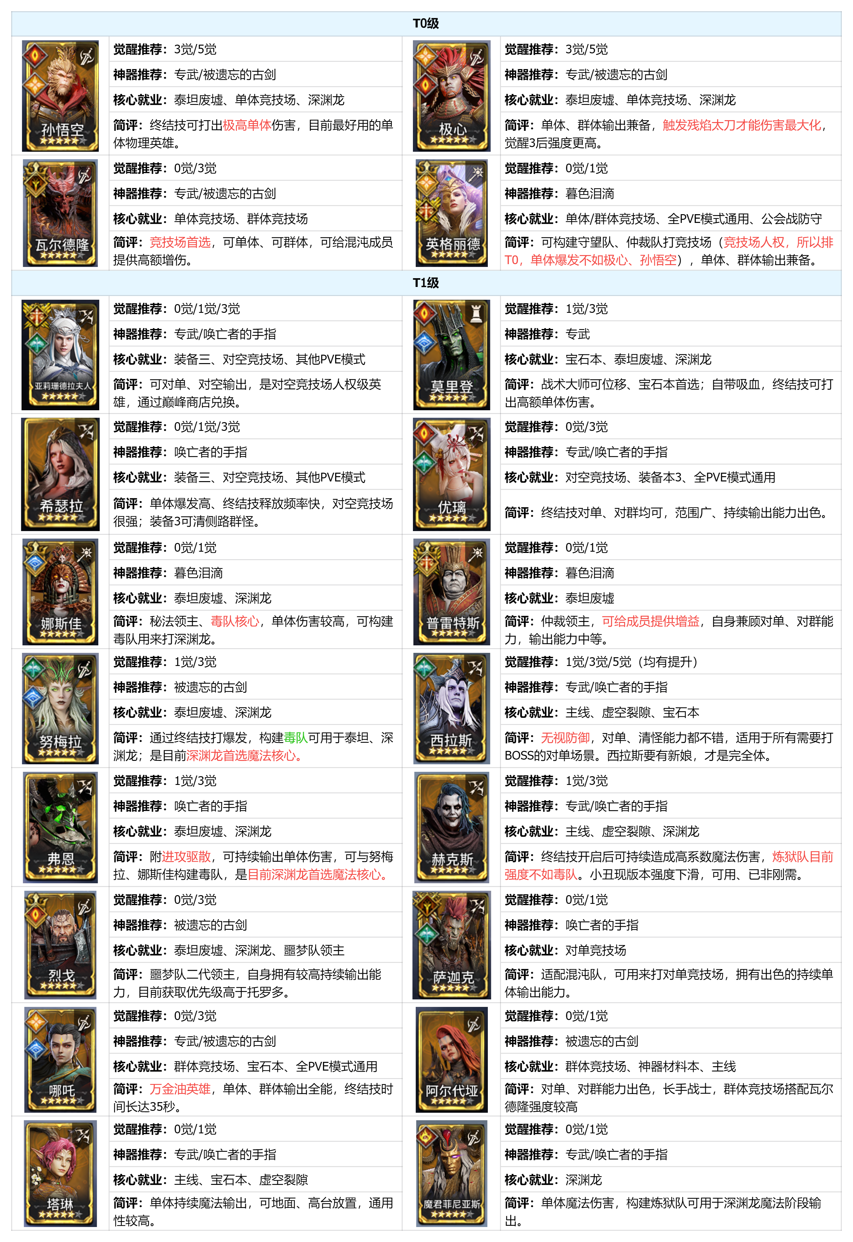 以上英雄为T2级别,但在部分场合下也有发挥的空间。在缺少强势T1时,可以用T2英雄下位替代,其中绯尔沙是限定角色。