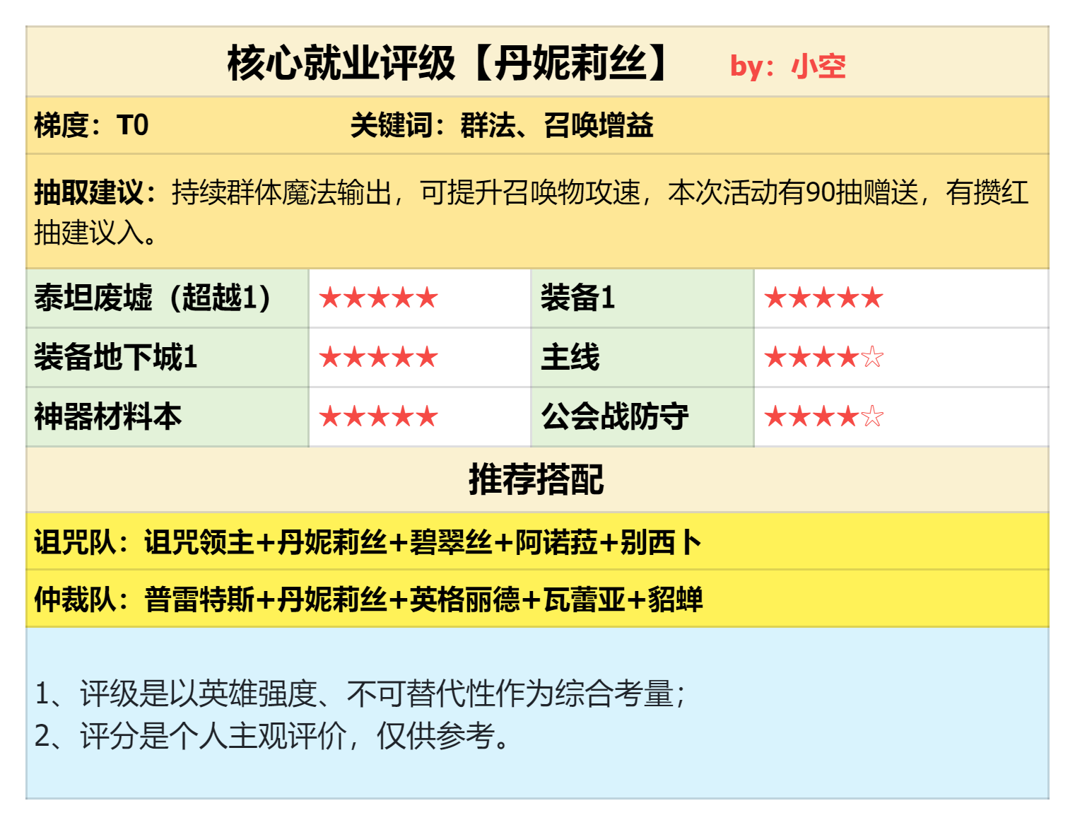 装备1&装备地下城1:丹妮莉丝输出高,可以快速清怪,是装备1的特化英雄;此外也同样适用于有清怪需求的装备地下城1,因为伤害更高,可降低数值门槛。