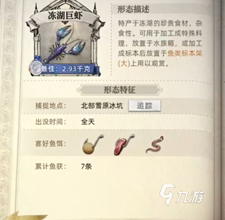 来到这里后打开小地图放大能看到一个蓝色区域这里就是冻湖所在位置,之后到了这里后就能开始捕捉了,捕捉的时候可以在生物记录中查看它所喜欢的鱼饵,利用这些鱼饵钓它的话概率是非常高的,钓出来后后续可以进行养殖。