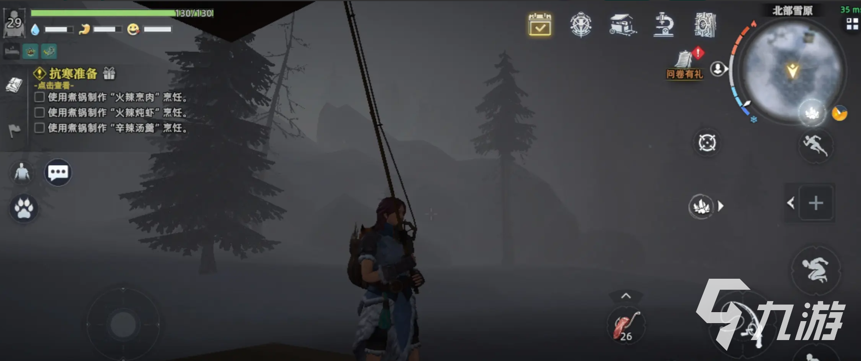 所以想要生存我们首先要去狩猎雪地狼和雪兔,获取原材料来制作出御寒衣物风雪衣,另外还要带好火把、篝火等原材料,利用这些来御寒,需要注意当雪原上出现暴风雪的时候,会导致无法正常生活,此时需要先搭建一个简易的遮雪大棚才能继续生火保暖。